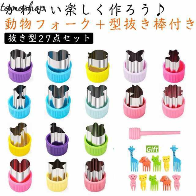 | かわいい楽しく作ろう♪ 抜き型27点セット 動物フォーク+型抜き棒付き イルカ、恐竜、星、ハート、菊、桜、魚、蝶、雛、鼠、ユニコーン、アザラシなど16種類のセットで、保育園、お家でのクッキングに便利! 型抜き棒付きで耐摩耗性と滑り止めがあり、使いやすく楽しく型抜きができます! またキャップ付きで手が痛くならず、野菜ぬきができます。 汚れの落としやすいステンレス製で引き裂きやすく、掃除が簡単。 透明な包装ケースで収納にもプレゼシトにも最適! | |