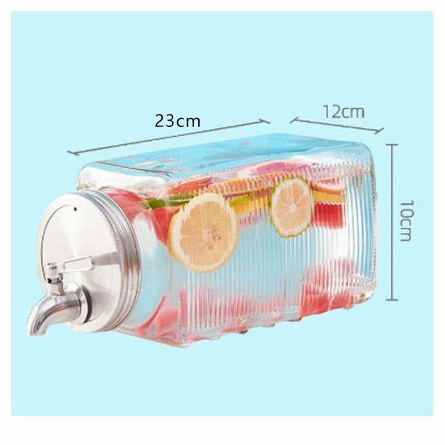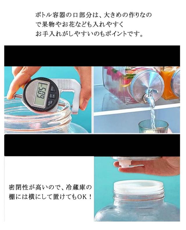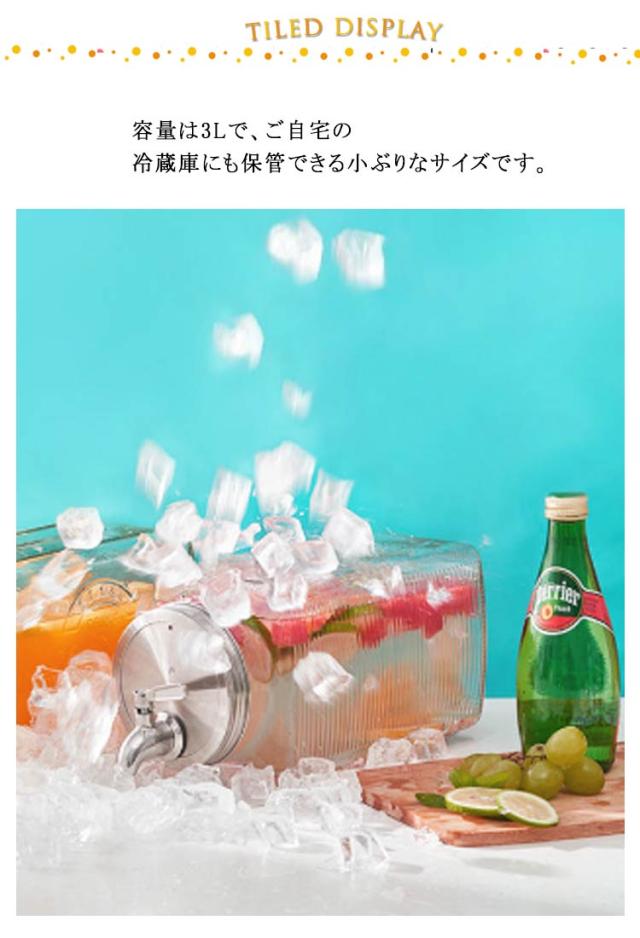 | ガラス&ステンレス製3L大容量ピッチャー。【横置き】 容量は3Lで、ご自宅の冷蔵庫にも保管できる小ぶりなサイズです。 密閉性が高いので、冷蔵庫の棚には横にして置けてもOK! ボトル容器の口部分は、大きめの作りなので果物やお花なども入れやすくお手入れがしやすいのもポイントです。 便利なプレス蛇口のデザインで、水の出す量を制御しやすい、使いやすいです。家庭のお年寄りも、子供も簡単に使えます。 | |