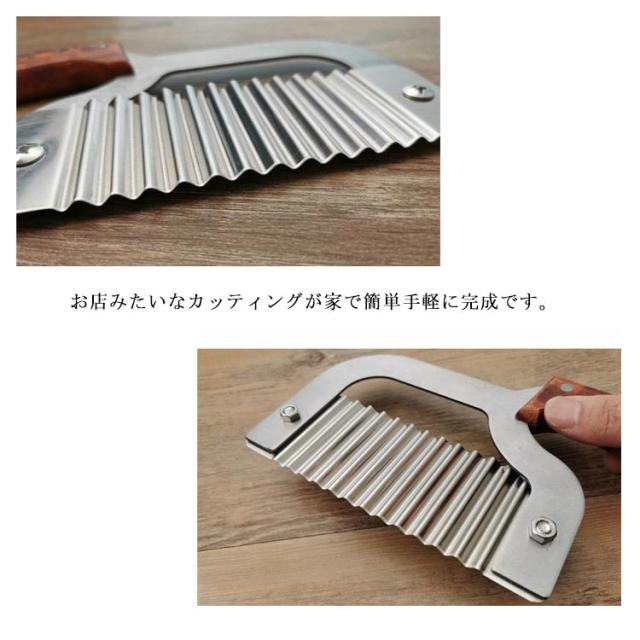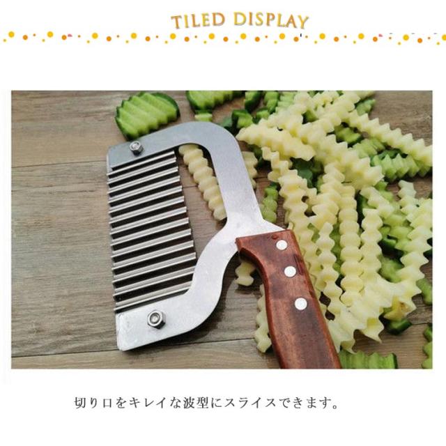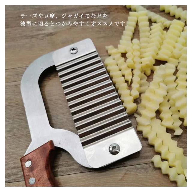 | 家族みんなで楽しめる飾り切りが簡単に! 切り口をキレイな波型にスライスできます。 お店みたいなカッティングが家で簡単手軽に完成です。 じゃがいもをカットし揚げれば、なみなみフライドポテトに。 チーズや豆腐、ジャガイモなどを波型に切るとつかみやすくオススメです。 | |