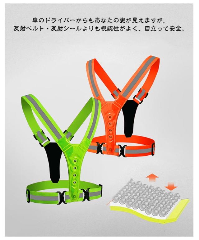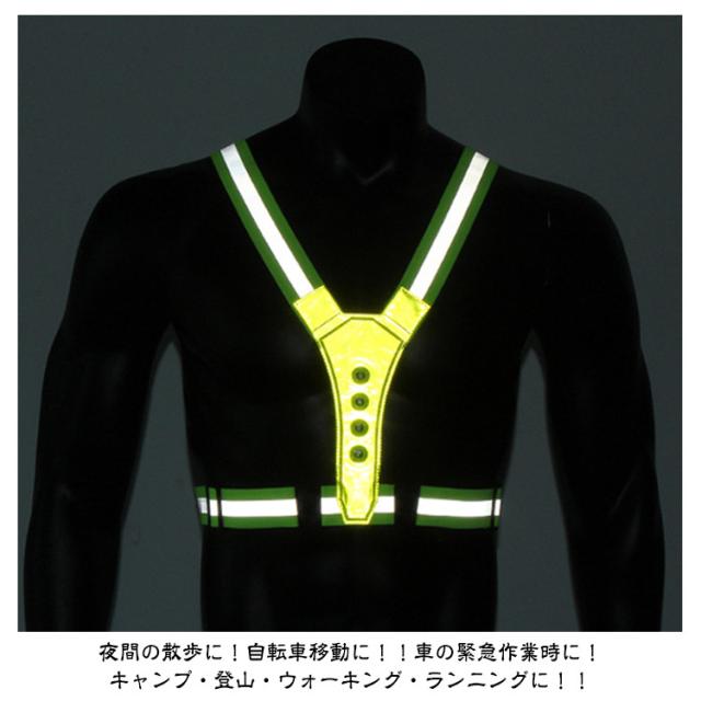 | 【Y型ベスト式】高輝度LEDライトを搭載した充電式のLED反射タスキです LEDライトを搭載し存在を知らせますので、夜間や暗いところでの事故の確率を減らせます。 夜間の散歩に!自転車移動に!!車の緊急作業時に!キャンプ・登山・ウォーキング・ランニングに!! 調節可能なデザインで、子供から大人まで幅広い年齢層に対応可能。 充電式なので、アダプターなどで充電が可能です 車のドライバーからもあなたの姿が見えますが,反射ベルト・反射シールよりも視認性がよく、目立って安全。 3つ照明モード: 速いフラッシュ-遅いフラッシュ-長いフラッシュ-オフ(スイッチによってON/OFF制御)。車のドライバーからもあなたの姿が見えますが,反射ベルト・反射シールよりも視認性がよく、目立って安全。 | |