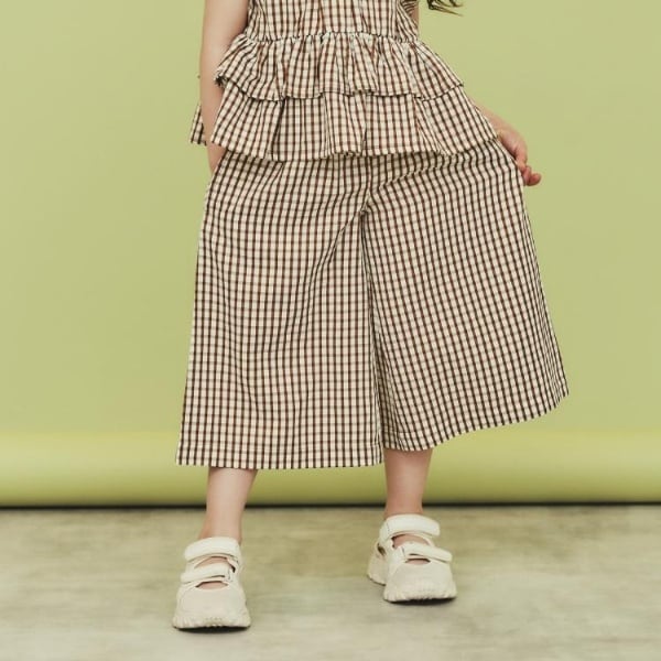 ギンガムチェックが可愛い、裾がワイドなスカーチョパンツ。