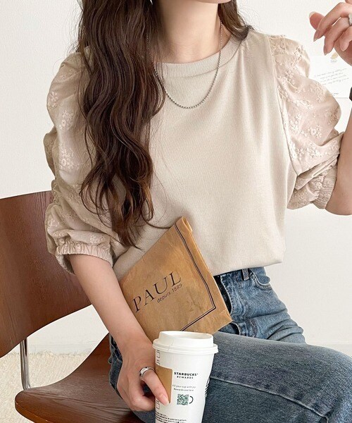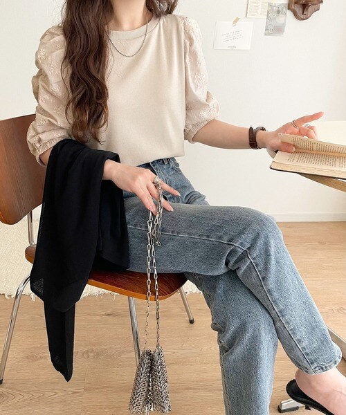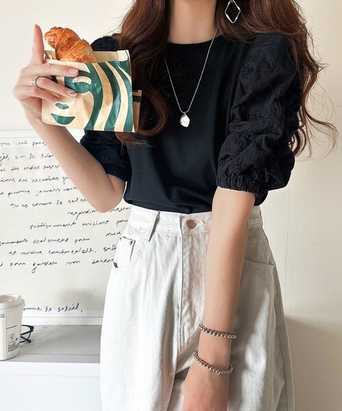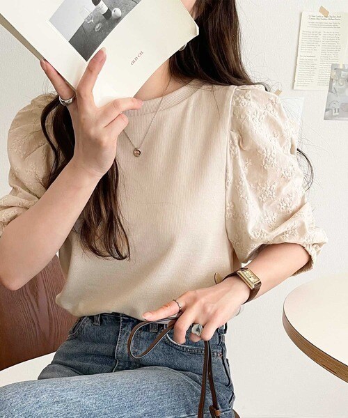 トレンドのパフスリーブに花柄レースを組み合わせ、甘さを効かせた