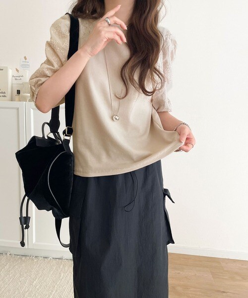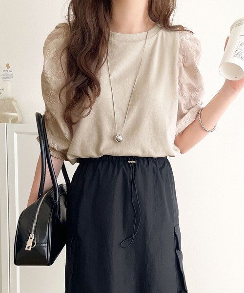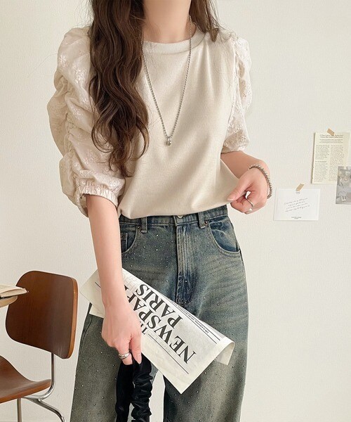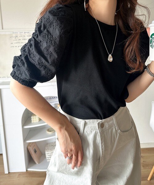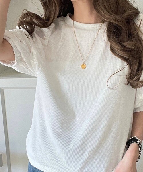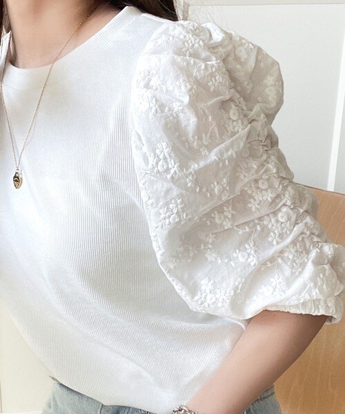 一枚で魅せる花柄スリーブの魔法。綿100%ふんわり袖花柄レースギャザードッキングトップス(半袖)