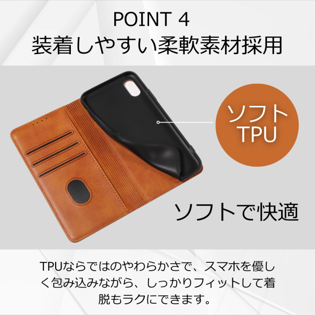 外側は高級感のあるPUレザー、内側は衝撃をやわらげるTPU素材を採用し、大切な端末をしっかり保護します。