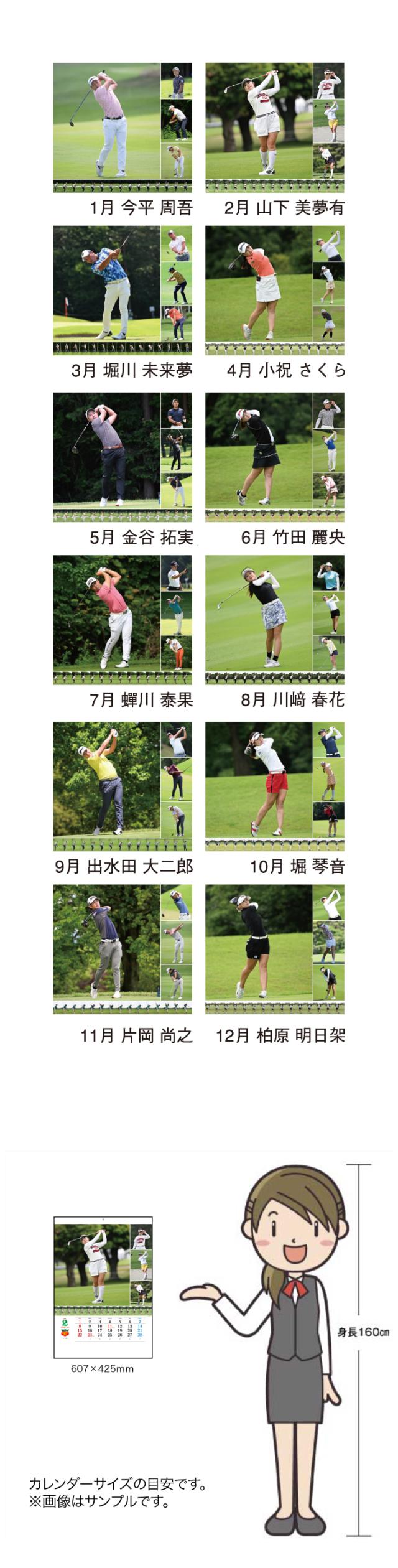 | 商品特徴 | ・日本の男女トッププロの競演 ・12名の夢のオールスターによるナイスショット ・カレンダーを綴る部分を金具ではなく、厚紙を使用しホットメルトという接着剤を使用した、環境に優しいエコカレンダーになります。 ・廃棄する時も分別の必要がない、手間もかからず環境にも配慮した商品です。 |