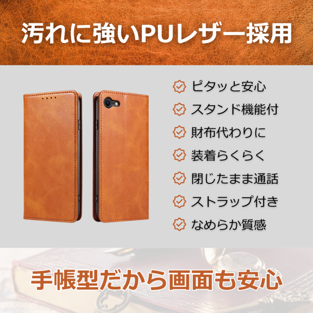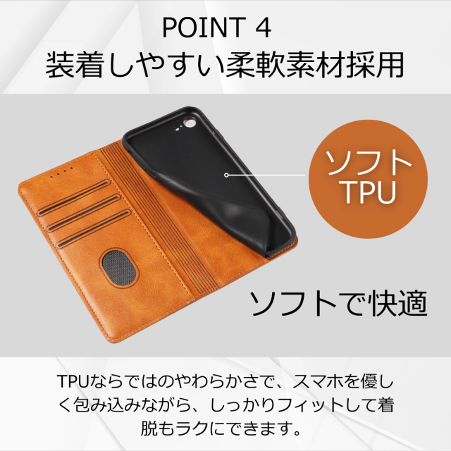 外側は高級感のあるPUレザー、内側は衝撃をやわらげるTPU素材を採用し、大切な端末をしっかり保護します。