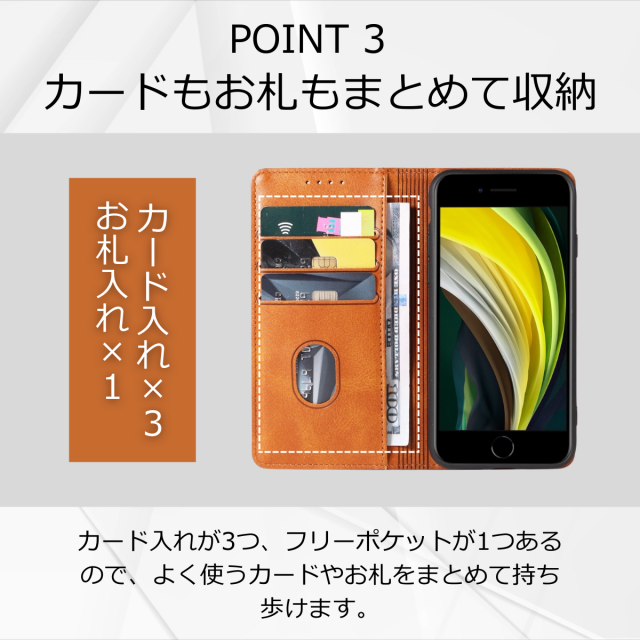 収納:カードポケット×3、紙幣やレシートが入るフリーポケット×1