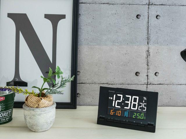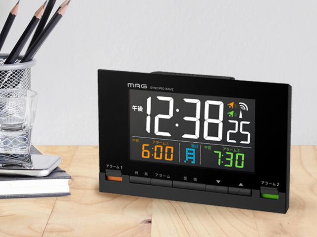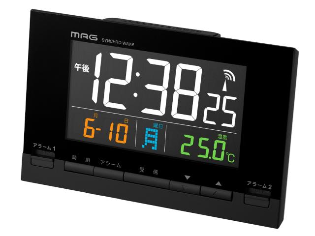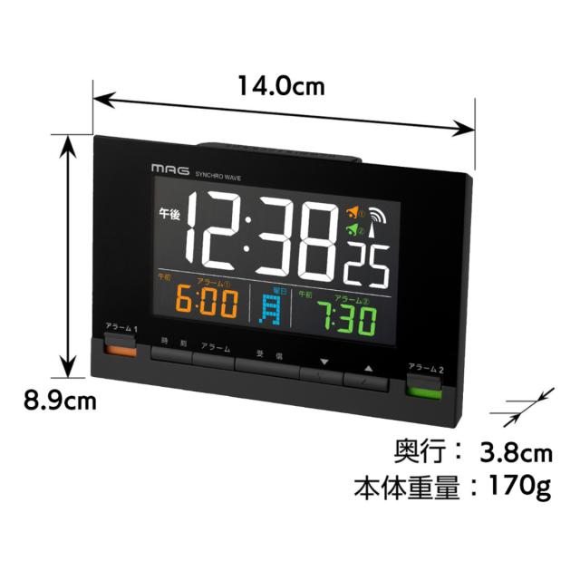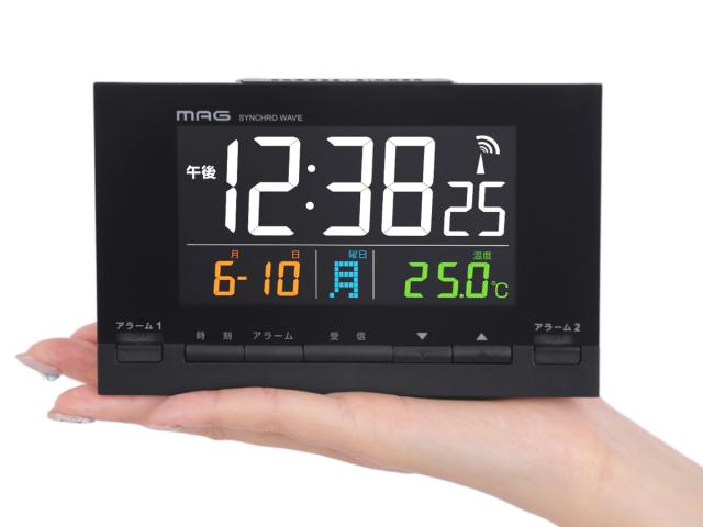 目覚まし時計 カラーデジット 電波時計 デジタル時計 MAG 温度計付き ( 時計 デジタル カレンダー アラーム スヌーズ 電子音 電波 温度 見やすい ブラック 黒 目覚まし 日付 曜日 24時間表示 AC電源 ダブルアラーム 明るさ調節 )