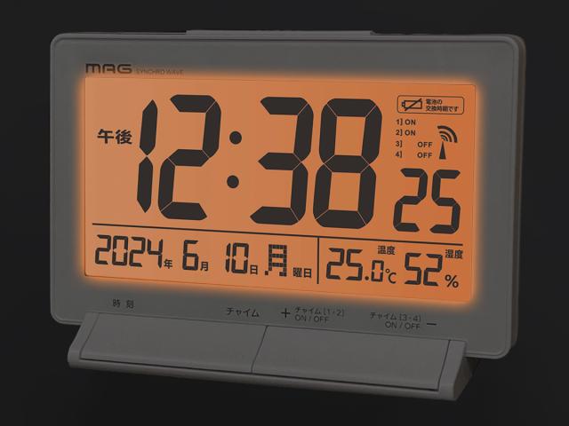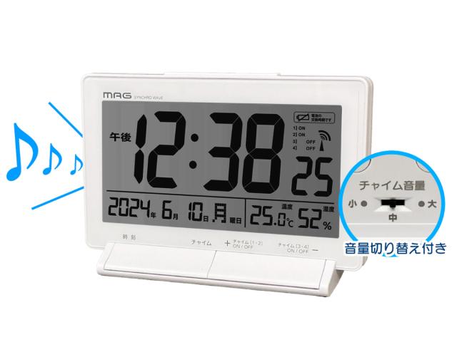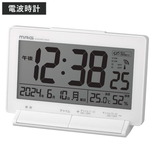 目覚まし時計 タイムチャイム 電波時計 デジタル時計 MAG 温湿度計付き ( 時計 デジタル カレンダー アラーム プログラムチャイム 電波 見やすい 電池 単三電池 目覚まし 日付 曜日 24時間表示 AC電源 音量調節 キンコンカンコン )