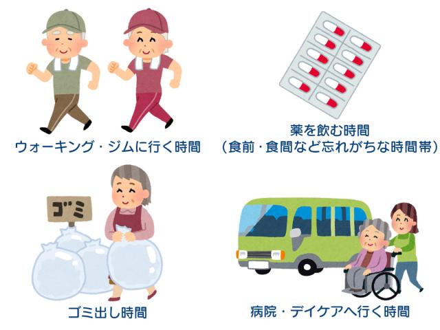 ご家庭では、服薬の時間、子供の時間管理(食事・宿題・ゲーム)に、職場では、始業・就業時刻、朝礼時間、休憩時間のお知らせなどさまざまなシーンでご利用いただけます。