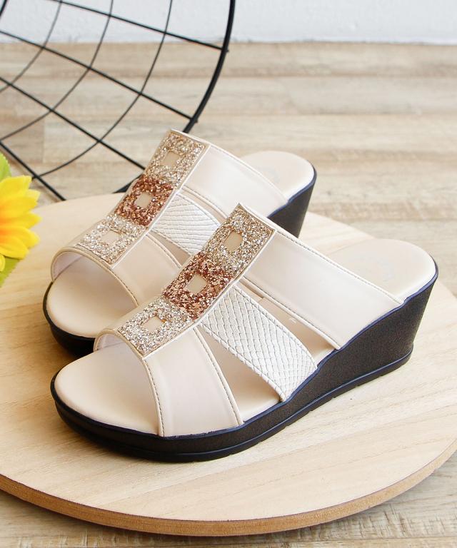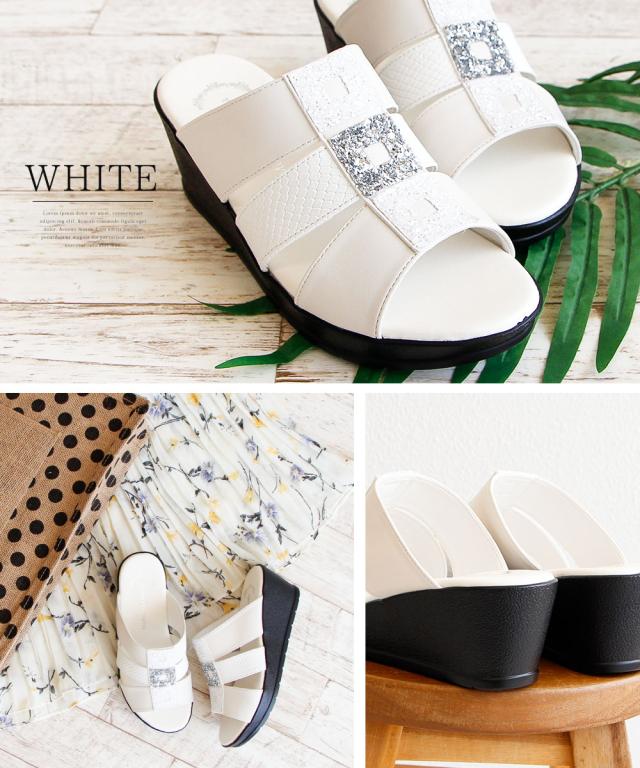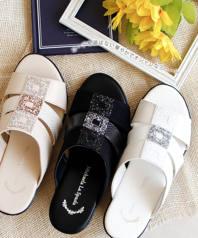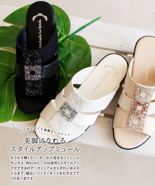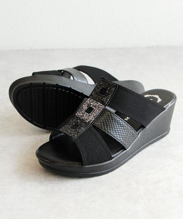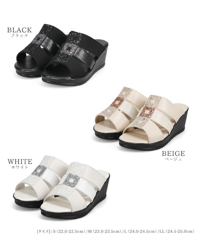 サンダル レディース ミュール サンダル ウェッジソール つっかけ 6cm 美脚 ヒール 履きやすい 歩きやすい 軽量 軽い ウエッジソール 婦人 カジュアル モード きれいめ 春夏 黒 ブラック キラキラ ラインストーン 2004