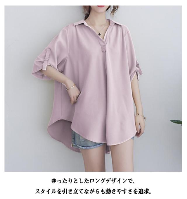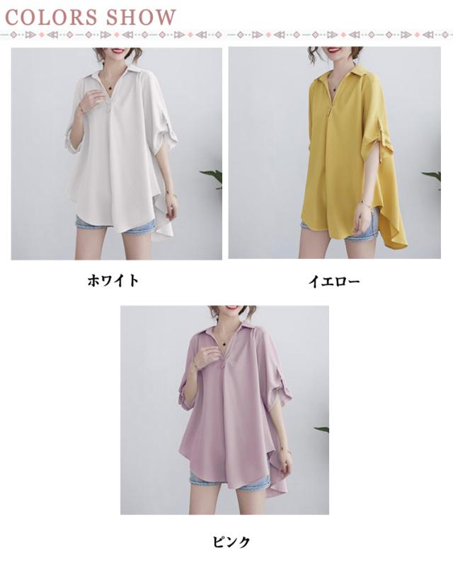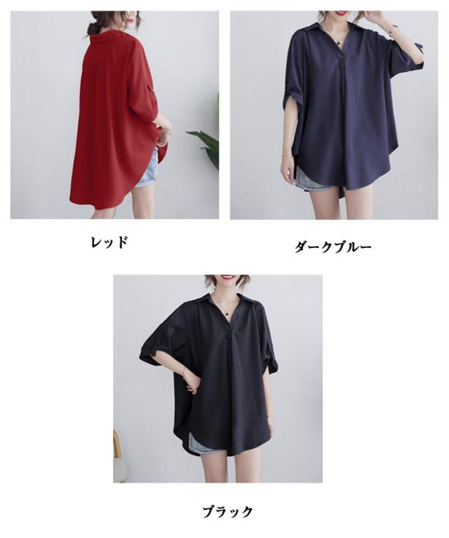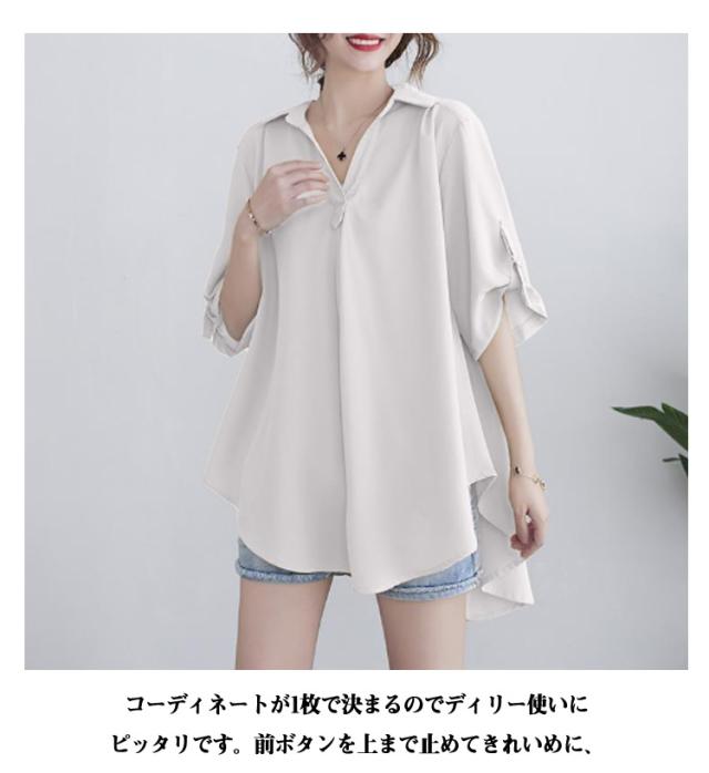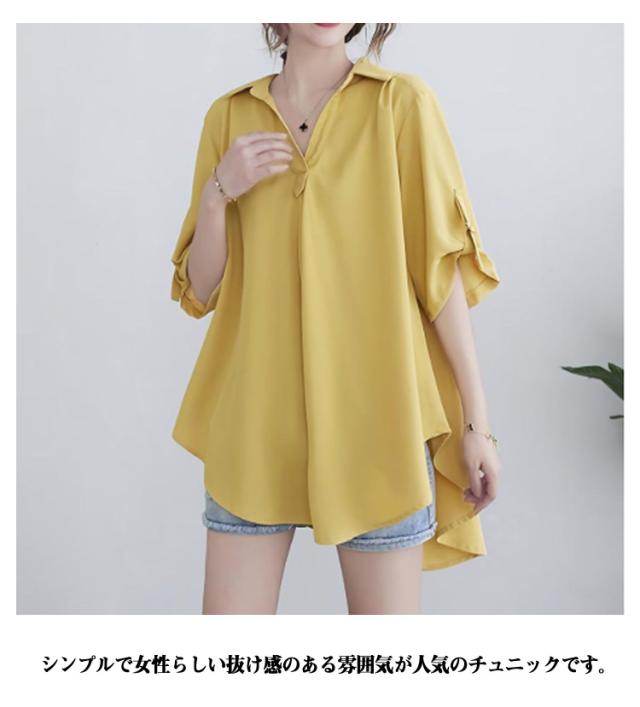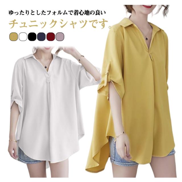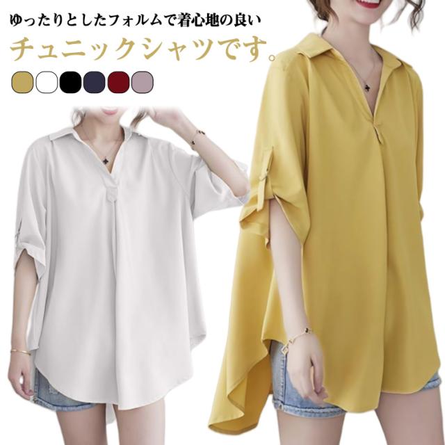 レディース チュニックブラウス 立ち襟 大きいサイズ ナチュラルカラーシャツ フレア 羽織り トップス 半袖シャツ 前開き ロング ドロップショルダ 春 ゆったり ビングシルエット 半袖 チュニックブラウス 夏 ロングシャツ 半袖チュニック 大人可愛い