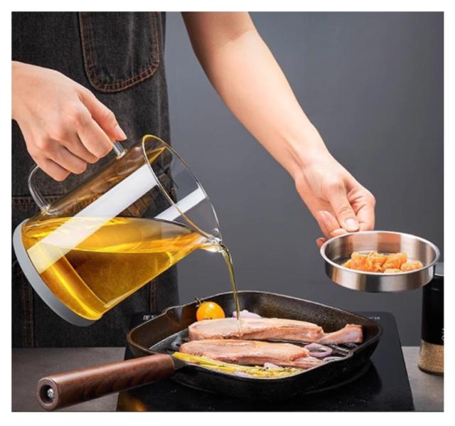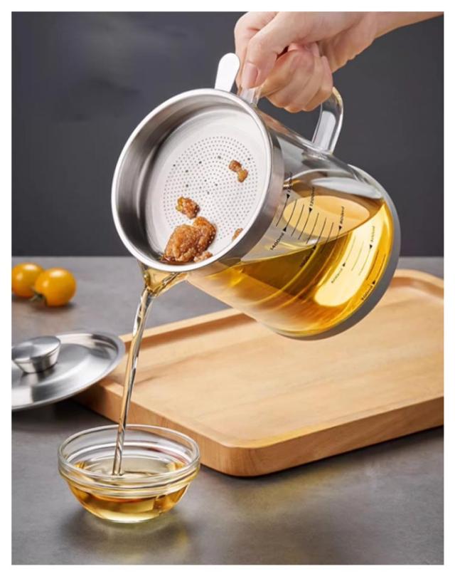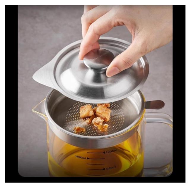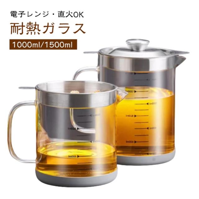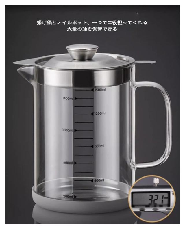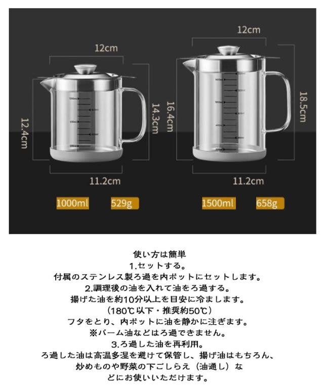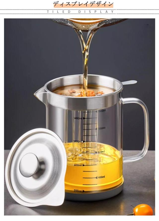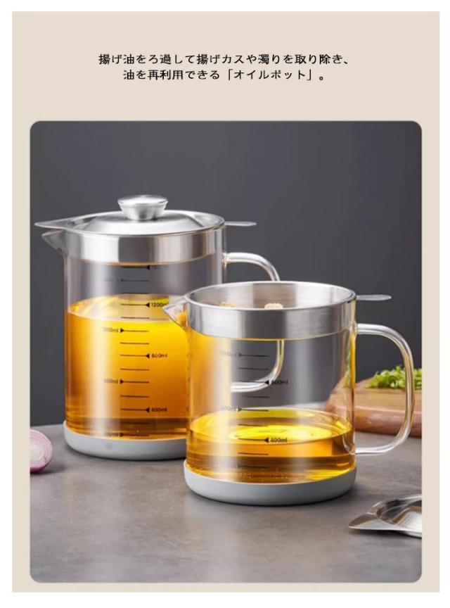 | 1000ml/1500ml 電子レンジ・直火OK 耐熱ガラス フィルター+蓋付き オイルポット 揚げ油をろ過して揚げカスや濁りを取り除き、油を再利用できる「オイルポット」。 【特徴】 ・揚げ鍋とオイルポット、一つで二役担ってくれる ・大量の油を保管できる 使い方は簡単 1.セットする。 付属のステンレス製ろ過を内ポットにセットします。 2.調理後の油を入れて油をろ過する。 ・揚げた油を約10分以上を目安に冷まします。(180℃以下・推奨約50℃) ・フタをとり、内ポットに油を静かに注ぎます。 ※パーム油などはろ過できません。 3.ろ過した油を再利用。 ろ過した油は高温多湿を避けて保管し、揚げ油はもちろん、炒めものや野菜の下ごしらえ(油通し)などにお使いいただけます。 | |