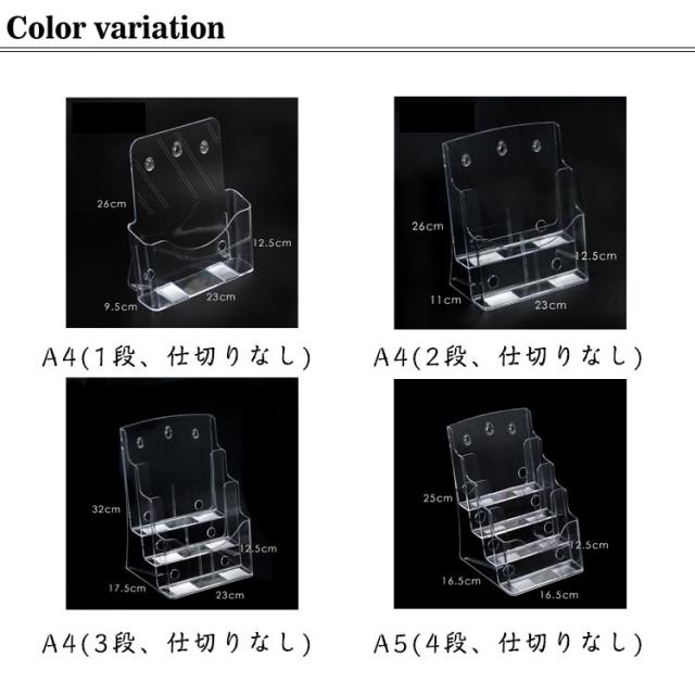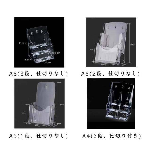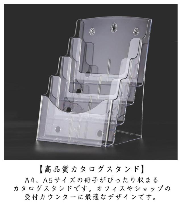 | シンプルなアクリル製卓上マガジンラック。【A4/A5サイズ】【3段/4段】【立て/壁掛け2way】 【高品質カタログスタンド】A4、A5サイズの冊子がぴったり収まるカタログスタンドです。オフィスやショップの受付カウンターに最適なデザインです。 【多用途パンフレットスタンド】カタログ、パンフレット、チラシ、書類ケースとしても使える汎用性の高いアイテムです。展示会やイベントでも活躍します。 【スタイリッシュなデザイン】透明なアクリル素材を使用し、どんなインテリアにもマッチするシンプルでおしゃれなデザインです。 卓上のパンフレットラックやチラシスタンド、マガジンラックとしても利用可能です。 | |