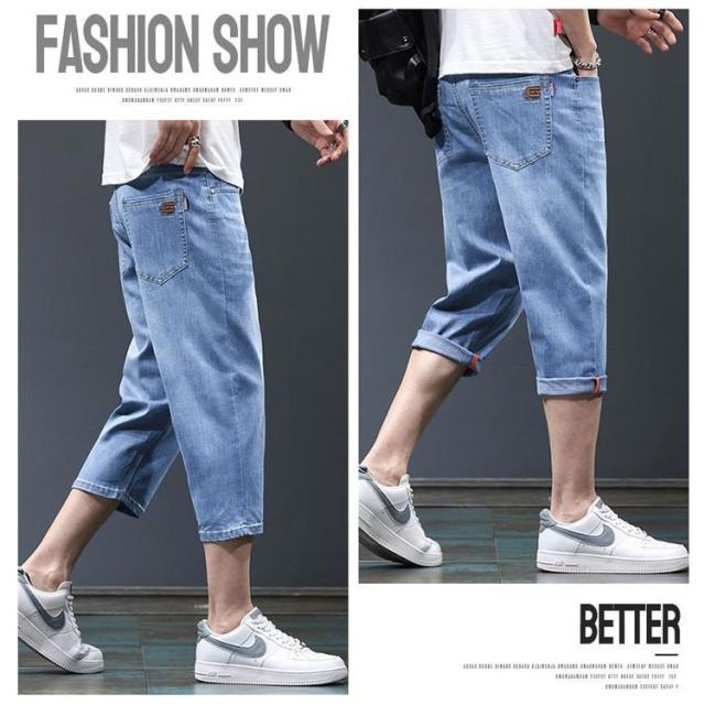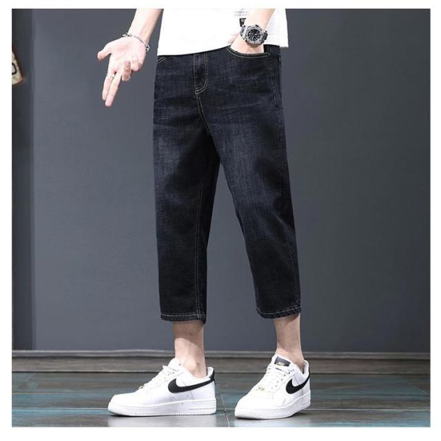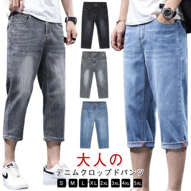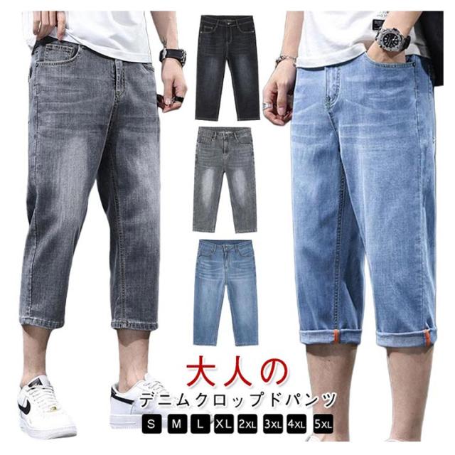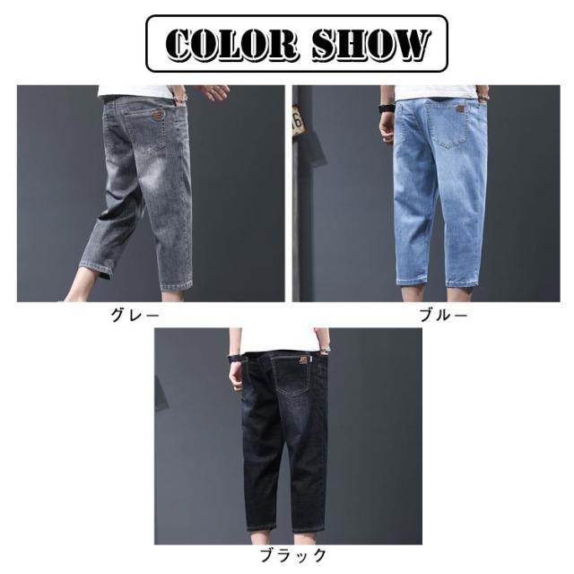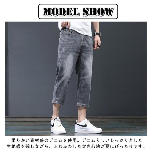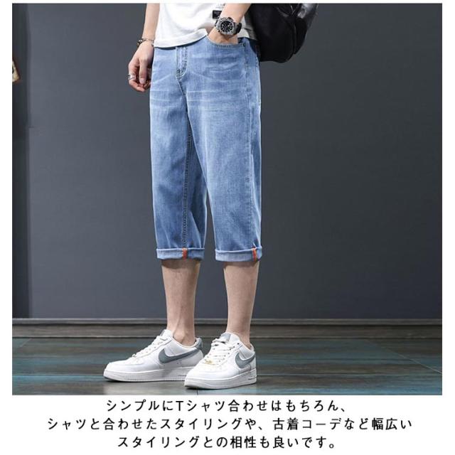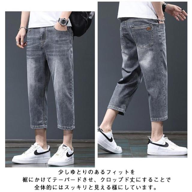 7分丈 春 メンズ デニムテーパードパンツ クロップド丈 薄手 夏 デニムテーパードパンツ ハーフパンツ クロップドパンツ テーパード 膝下丈 ジーパン デニム ジーンズ ストレッチ 春服 夏服 カジュアルパンツ 大きいサイズ 黒 ブラック ブルー 無地 メンズファッション