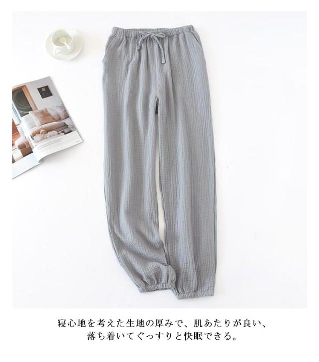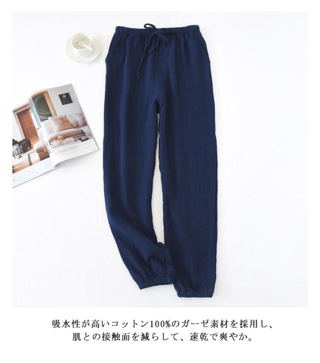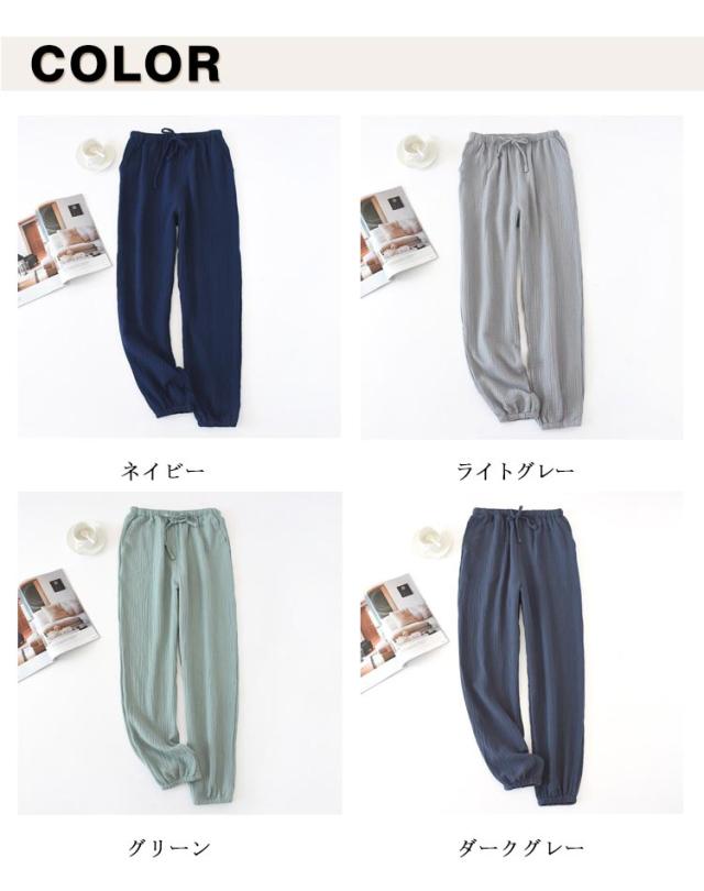 | シーズンを問わず、長い時期様々なシーンで大活躍するルームパンツです。 吸水性が高いコットン100%のガーゼ素材を採用し、肌との接触面を減らして、速乾で爽やか。 寝心地を考えた生地の厚みで、肌あたりが良い、落ち着いてぐっすりと快眠できる。 平らできれいな縫い目、ルームウェアパンツに敏感肌にもおススメします。 居宅や旅行中のホテル、病気での入院、通勤通学などの外出にも最適です。 | |