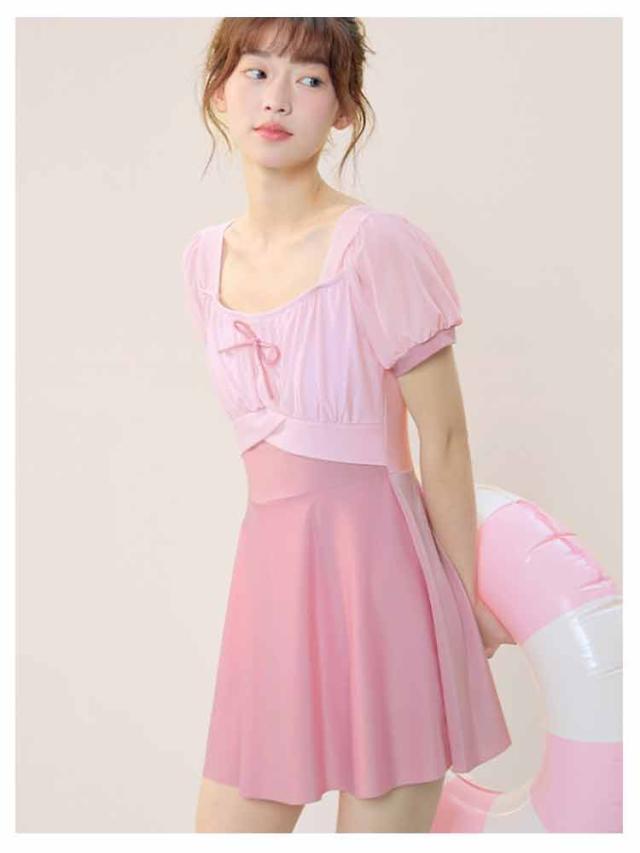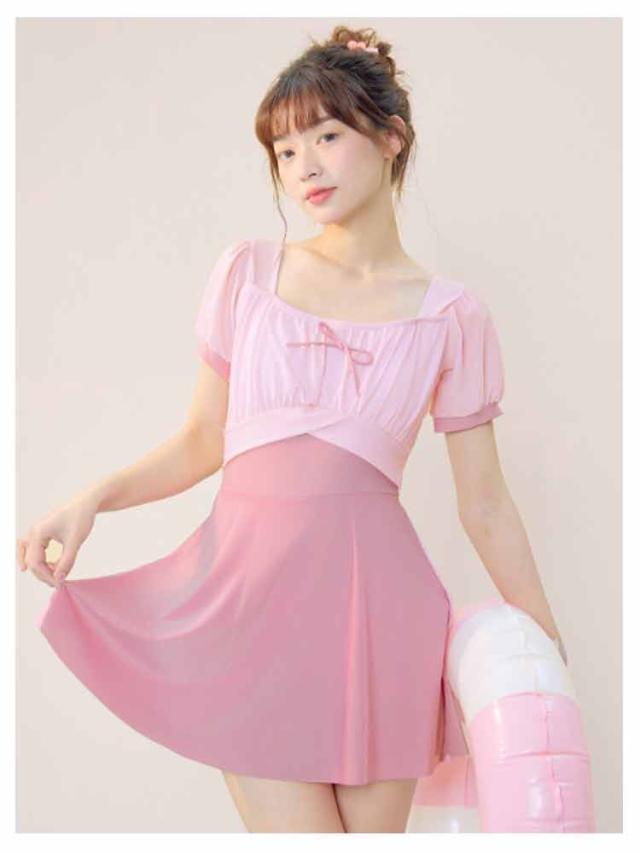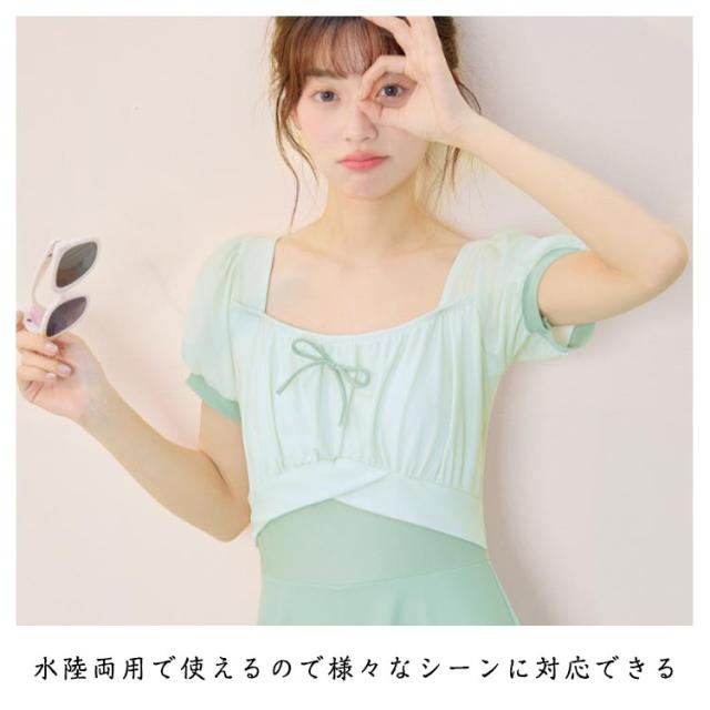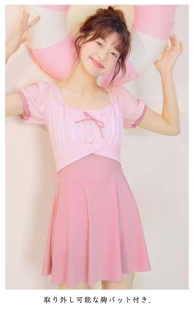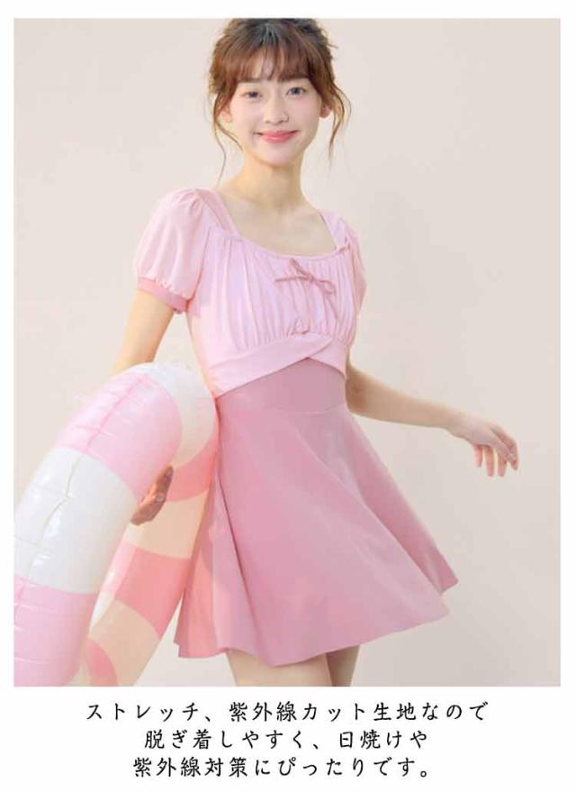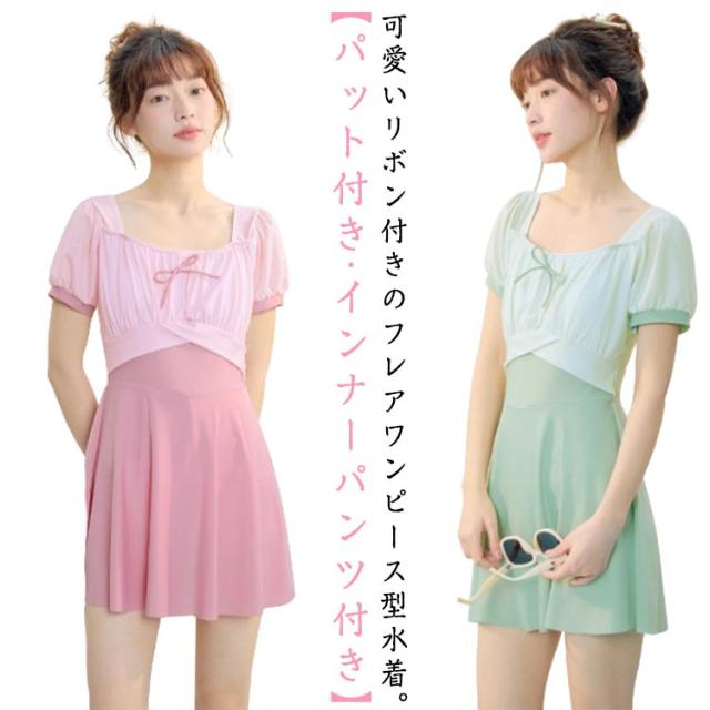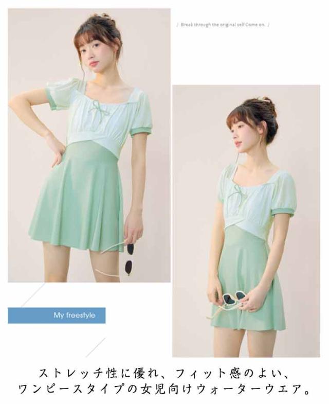 レディース 配色 スイムウェア レディース リボン付き ジュニア 水着 半袖 ワンピース フレアスカート インナーパンツ付き 子供 女子 セパレート 高校生 UVカット ワンピース水着 キッズ スイミング 水遊び プール 水泳 海 リゾート 露出控えめ フリーサイズ