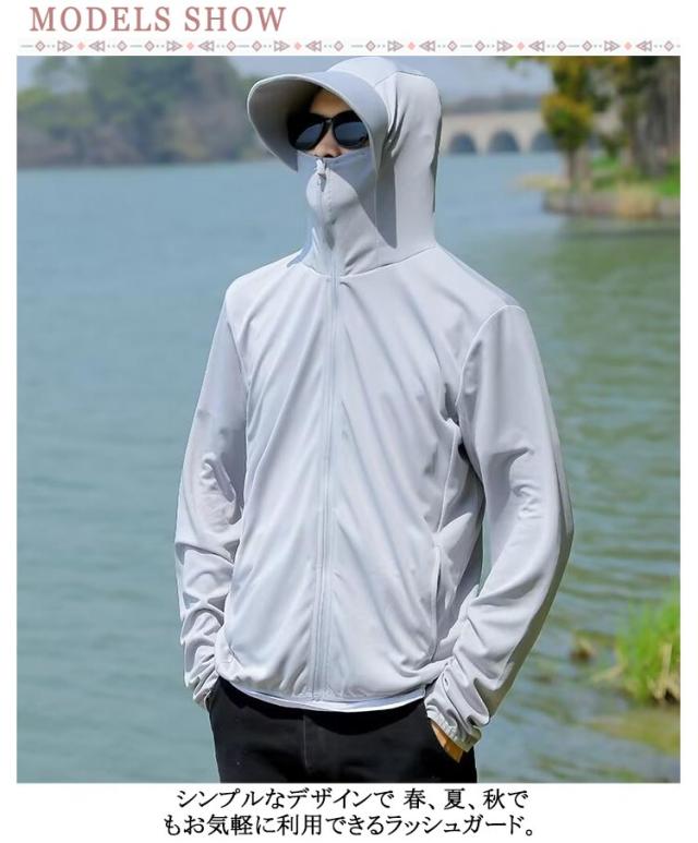| つば付きフード、指穴袖、フェイスまで覆えるガードでしっかりUV対策!お肌に有害な紫外線カット! シンプルなデザインで 春、夏、秋でもお気軽に利用できるラッシュガード。 冷感生地を使用しているので、 暑い季節もひんやり快適に過ごせます。 指穴袖だから、 手の甲までしっかり覆えます。 つば付きのフードとフェイスガードで顔や首を紫外線から守れるパーカータイプ。 ランニングやジムなどスポーツウェアとしても使える♪ | |