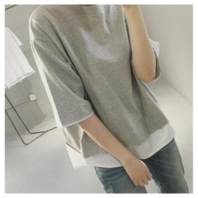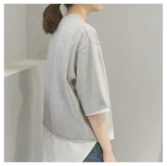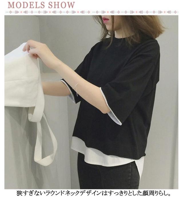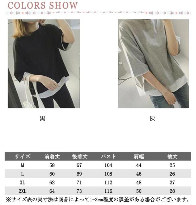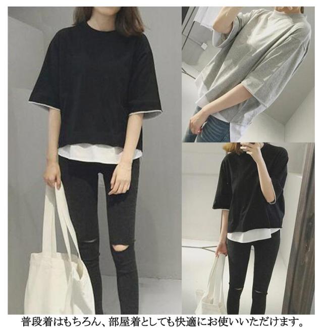 七分袖 tシャツ 重ね着風 トップス 7分袖tシャツ 半袖 レイヤード レディース 七分袖 5分袖 ラウンドネック 切り替え 可愛い 夏服 ブラック グレー 黒