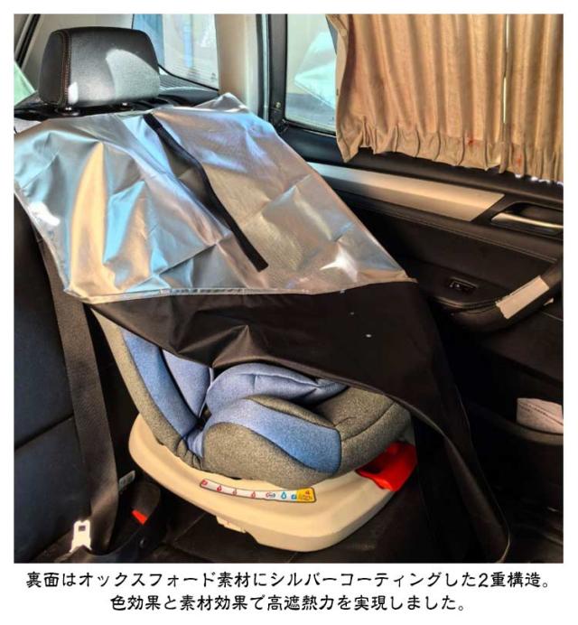 | 真夏の車内、高温の座席対策!車内温度がエンジン停止後わずか30分で50℃を超えることがあります。チャイルドシートには金具などがあり、その部分は火傷の危険があります。車から離れる前に、遮熱カバーをサッとかけるだけで熱を遮断し、チャイルドシートの温度上昇を防ぎます。 遮熱カバーは、シンプルなスタイルで使いやすく、高性能です。素材の2重構造と色彩の持つ遮熱効果で、覆った部分の下へ熱が伝わりにくいので、遮熱カバーを外したらお子様を指定席に座らせることができます。 遮熱カバーを広げ、チャイルドシートの上部分やカーシートのヘッドレスト部分に掛け、シートを前へ垂らすだけです。保護した部分の温度上昇を和らげます。 裏面はオックスフォード素材にシルバーコーティングした2重構造。色効果と素材効果で高遮熱力を実現しました。 コンパクトになる設計!三つ折りにしてクルクルと丸め、付属の紐を巻きスナップボタンで留めればコンパクトに!先端が輪になっているので引っ掛け収納も可能です。 野外へのお出かけやベビーカーからお子様を連れて離れる際にも遮熱カバーを利用できます。公園、プール、テーマパーク、海、山、川など、携帯してお使いいただけます! | |