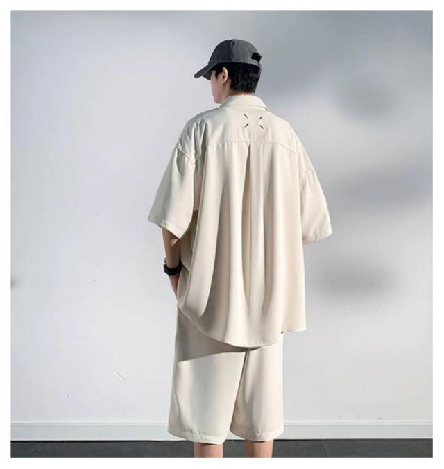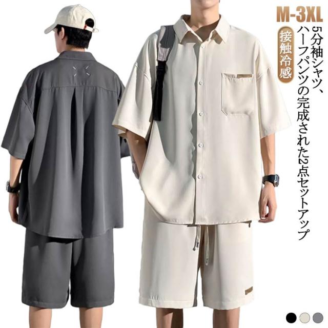 夏 セットアップ シャツジャケット ハーフパンツ 5分袖 メンズ 2点セット メンズ 接触冷感 ショートパンツ 半袖 半袖 カジュアル ワイドパンツ オーバーサイズ ビッグシルエット セットアップ きれいめ 無地 シンプル レイヤード リラックス 清涼感 春夏