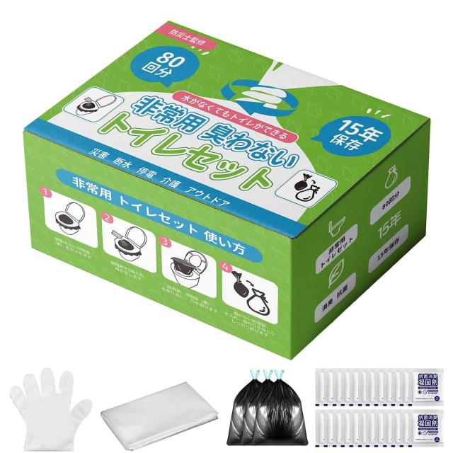 【充実なセット内容&】◆ひも付きの汚物袋 X80枚 ◆凝固剤 X80個、◆防臭袋 X5枚 ◆ビニー ル手袋 X100枚 ◆説明書 X1枚 ?より簡易トイレセットを検品しておりますが、当社の製品に不良などが発生した場合、またはその他の事由で交換されたい場合には、注文番号を記?の上、購入サイト内お買上けの販売店にを下さいませ。か新品交換をさせていただきます。