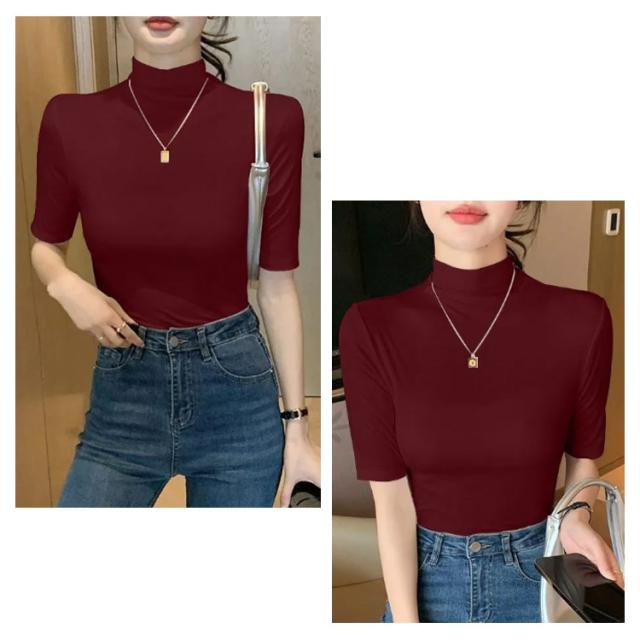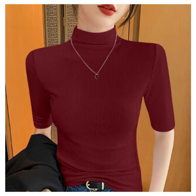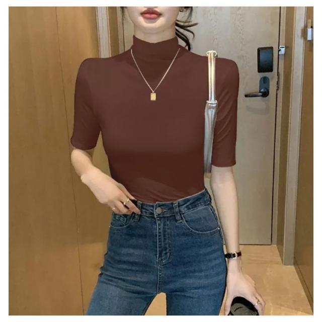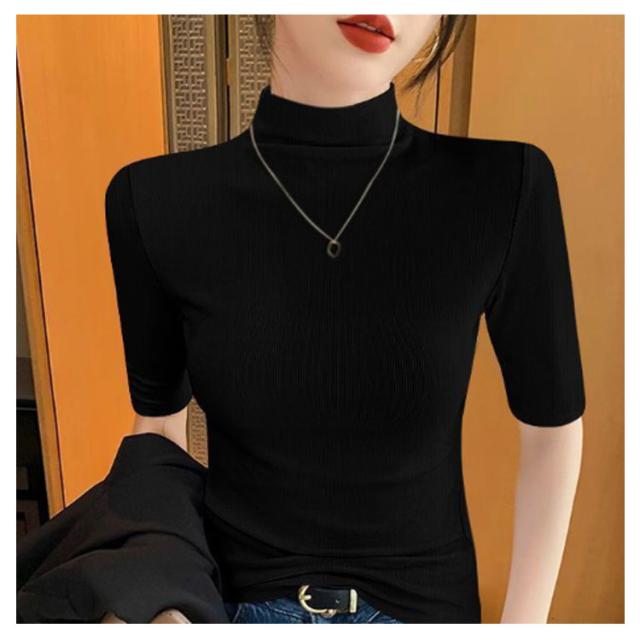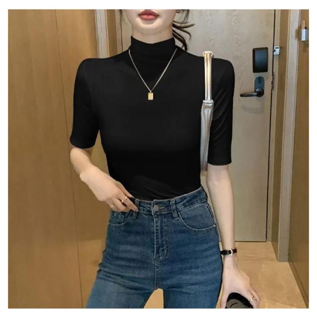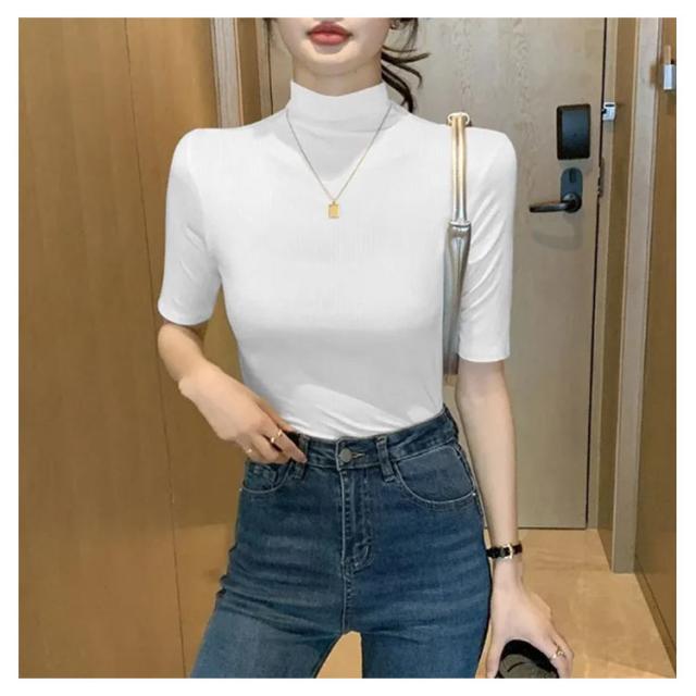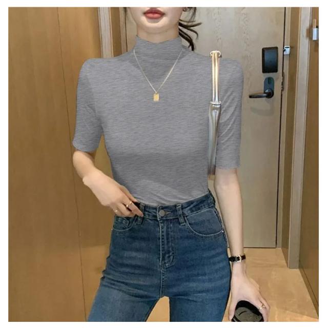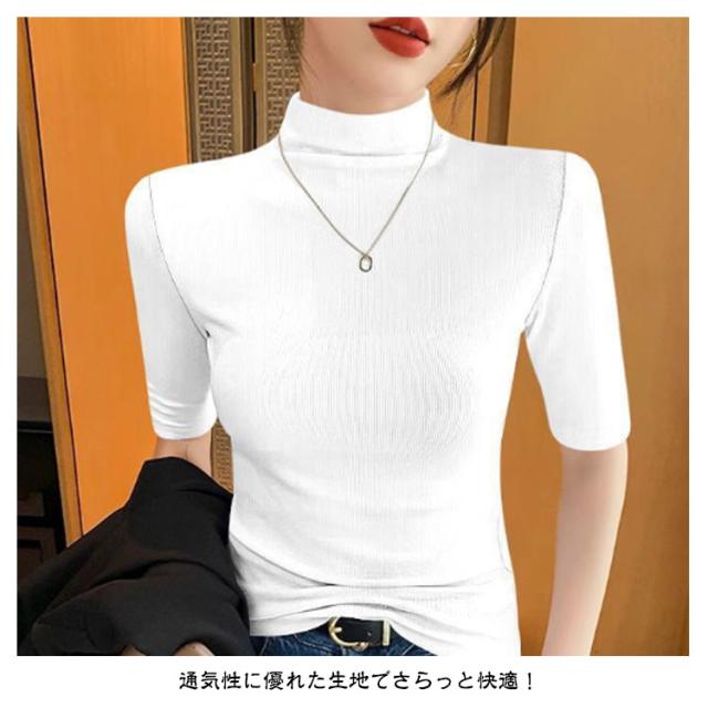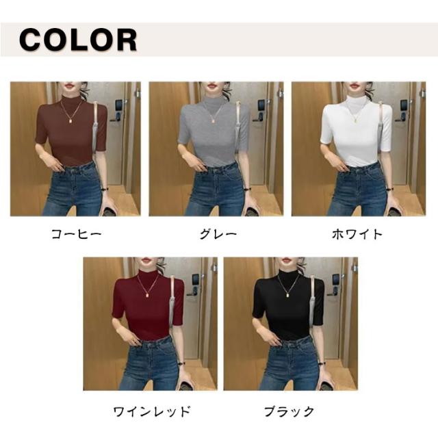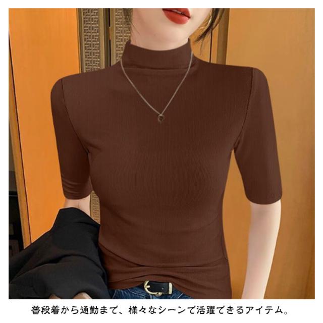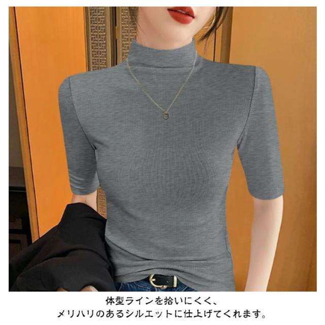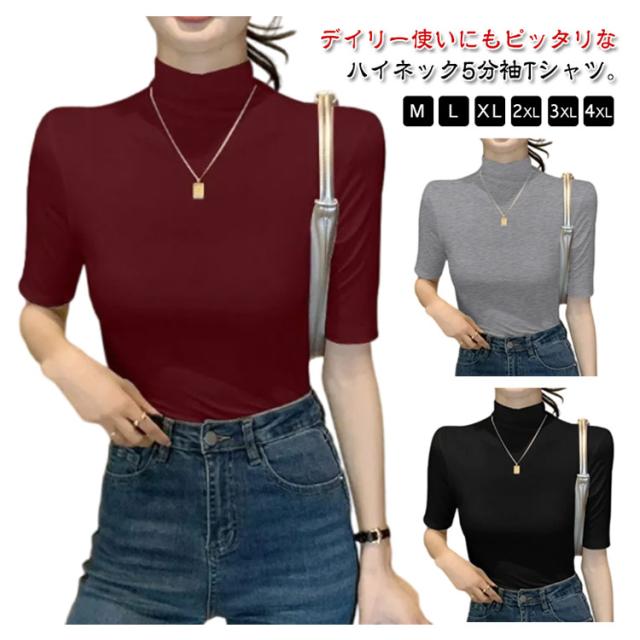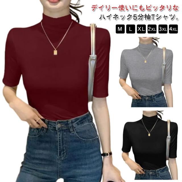 tシャツ 五分袖 無地 カットソー Tシャツ レディース リブ トップス ハイネック 半袖 インナー タートルネック ゴルフ 5分袖 ハイネックtシャツ 日焼け対策 伸縮性 大きいサイズ 春 おしゃれ 春夏 ハイネック 夏 秋 シンプル カジュアル 大きいサイズ