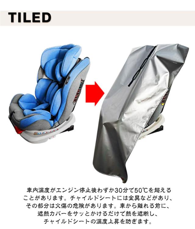 | 真夏の車内、高温の座席対策!車内温度がエンジン停止後わずか30分で50℃を超えることがあります。チャイルドシートには金具などがあり、その部分は火傷の危険があります。車から離れる前に、遮熱カバーをサッとかけるだけで熱を遮断し、チャイルドシートの温度上昇を防ぎます。 遮熱カバーは、シンプルなスタイルで使いやすく、高性能です。素材の2重構造と色彩の持つ遮熱効果で、覆った部分の下へ熱が伝わりにくいので、遮熱カバーを外したらお子様を指定席に座らせることができます。 遮熱カバーを広げ、チャイルドシートの上部分やカーシートのヘッドレスト部分に掛け、シートを前へ垂らすだけです。保護した部分の温度上昇を和らげます。 裏面はオックスフォード素材にシルバーコーティングした2重構造。色効果と素材効果で高遮熱力を実現しました。 コンパクトになる設計!三つ折りにしてクルクルと丸め、付属の紐を巻きスナップボタンで留めればコンパクトに!先端が輪になっているので引っ掛け収納も可能です。 野外へのお出かけやベビーカーからお子様を連れて離れる際にも遮熱カバーを利用できます。公園、プール、テーマパーク、海、山、川など、携帯してお使いいただけます! | |