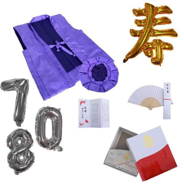 商品内容:ちゃんちゃんこ・大黒頭巾・白扇子・お祝いの栞,数字風船6、0両、寿の字風船1枚