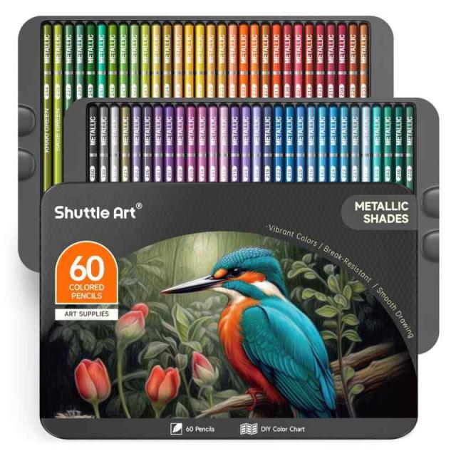 Shuttle Art 色鉛筆 カラーペン 大人の塗り絵 イラスト デザイン スケッチ 落書き 収納便利 子供 女の子 初心者 アーティスト 入学お祝い プレゼント (60色 メタリック)