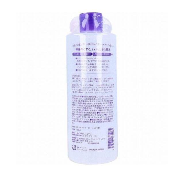 全成分:水、グリセリン、DPG、ハトムギ種子エキス、レモン果実エキス、アスコルビルグルコシド、グリチルリチン酸2K、アラントイン、BG、(スチレン/アクリレーツ)コポリマー、クエン酸、クエン酸Na、フェノキシエタノール、メチルパラベン
