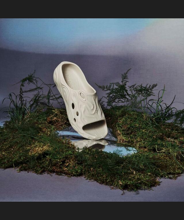 アッパー素材には藻類バイオマスから生成されたサステナブル素材「BLOOM」フォームを採用し、またスライド仕様で着脱がスムーズ。