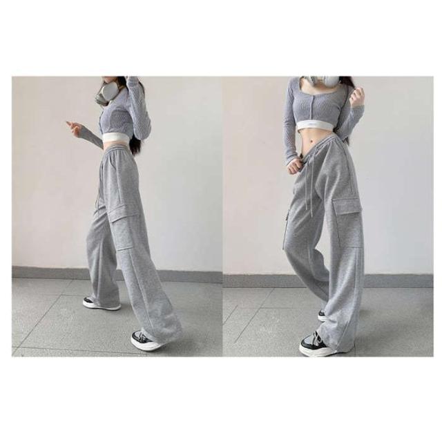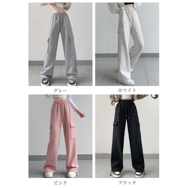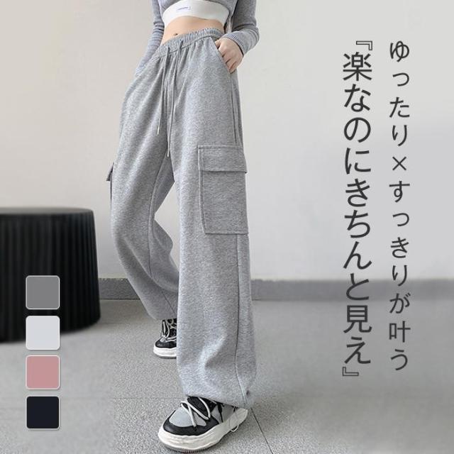 カーゴパンツ パンツ レディース ストレート ボトムス イージーパンツ ロング丈 無地春 夏 秋 ウエストゴム ワイド リラックス スウェット ワイドパンツ