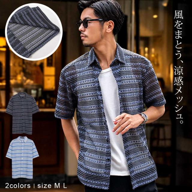 シャツ メンズ ブランド 半袖 半袖シャツ おしゃれ セットアップ可 ボーダー メッシュ 羽織 ブラック ブルー シンプル 無地 大人 黒 M L きれいめ 父の日 CavariA 20代 30代 40代 ユニセックス 男性 男 服 春 夏 夏服 春夏 ファッション [CARE25-27]