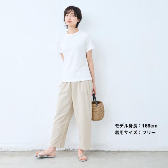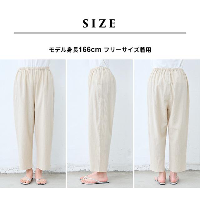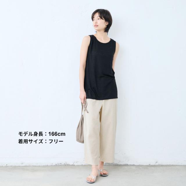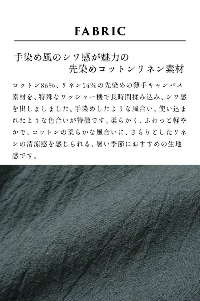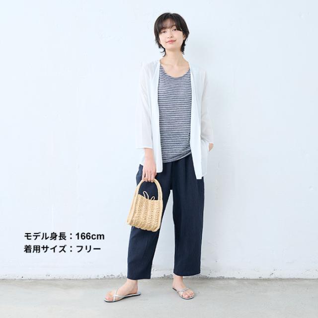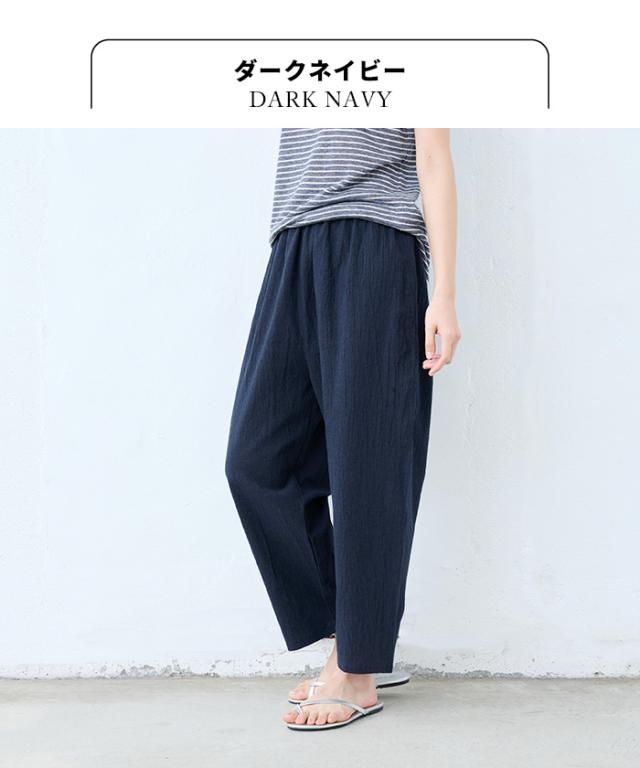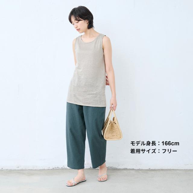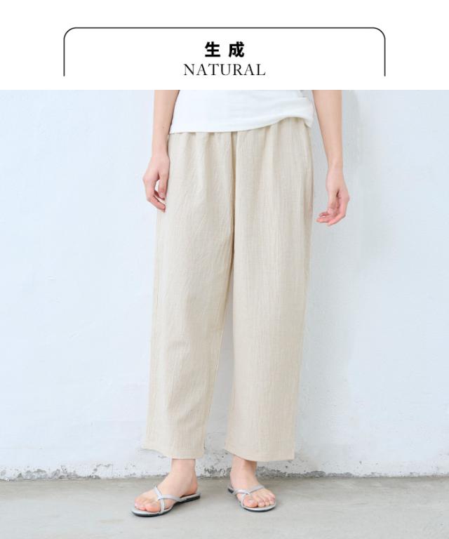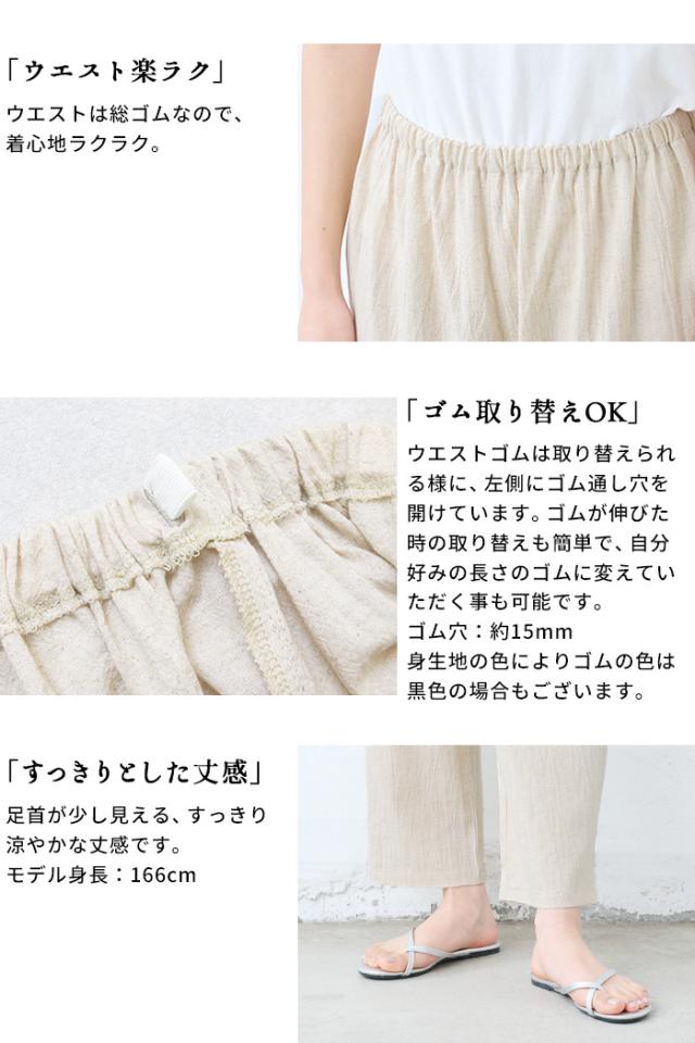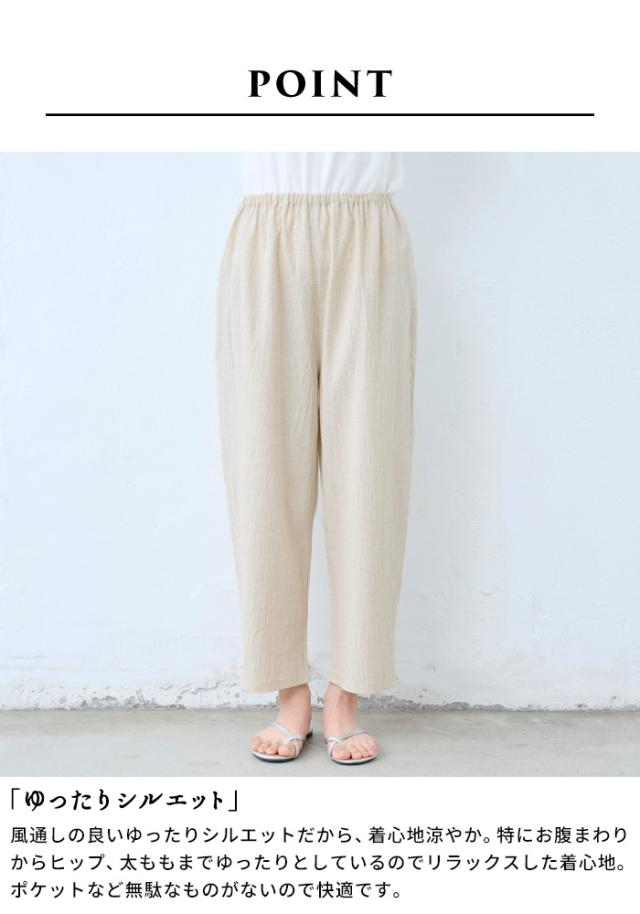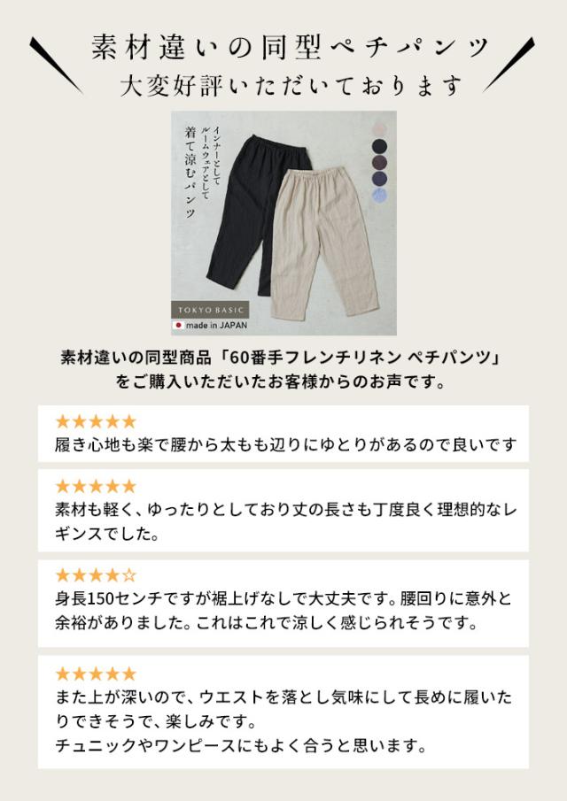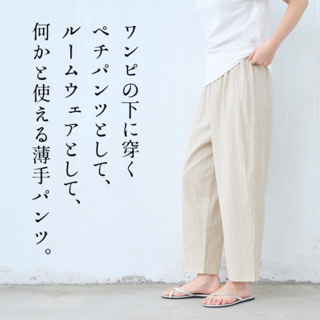 特徴 透け対策も、着心地も。夏の味方、綿麻ペチパンツ。ワンピの下に穿くペチパンツとして、ルームウェアとして、何かと使える薄手パンツ。肌離れのよい綿麻素材に、手染め風の自然なシワ感をまとわせた、大人のためのペチパンツ。やわらかな風合いと、軽やかな穿き心地が魅力。薄手のワンピースやスカートに一枚添えるだけで、透け感をやさしくカバー。暑い季節もムレにくく、心地よく過ごせるのは、天然素材ならではの嬉しいポイントです。レギンス感覚でワンピースやチュニックの下に穿いたり、ノンストレスな穿き心地でルームウェアとしても◎