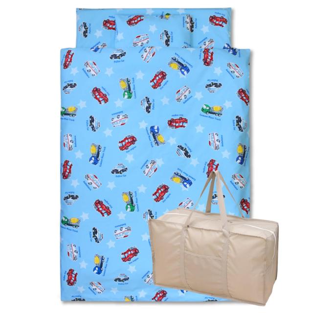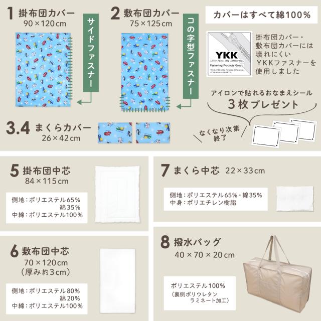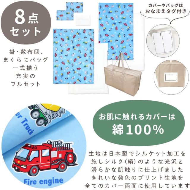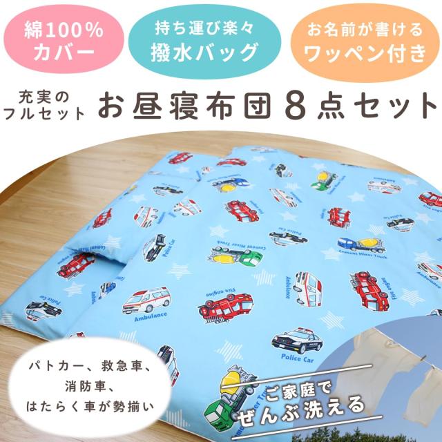 お昼寝布団セット はたらく車 充実の8点セット 綿100% 洗える敷き布団 防水バッグ 名前ワッペン ネームタグ お昼寝ふとん ファスナーカバー 保育園 コンパクト 子供 キッズ un doudou OHF