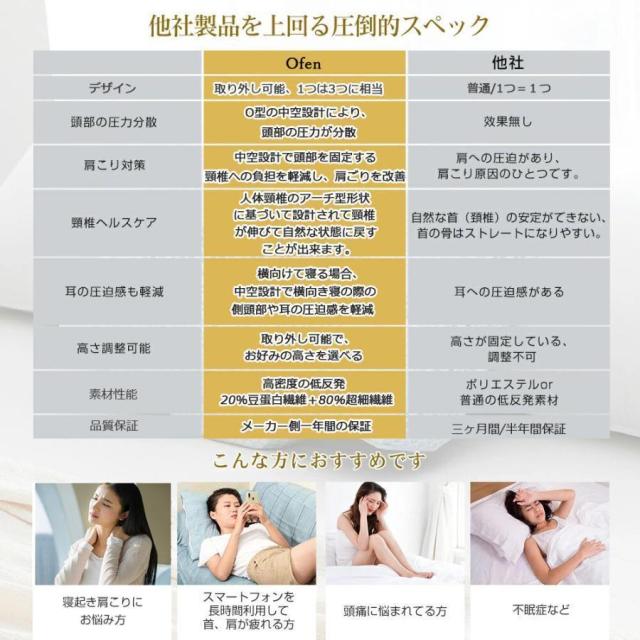 補充物:20%豆蛋白繊維+80%超細繊維 重量:約1.3kg 【枕が合わなくてお悩みの方へ】:肩こりいびき疲れ頭痛慢性的な肩こり、頭痛、不眠、疲労感…毎日身体に合わない枕で眠っていると、どんどんストレスをため込むことになります。【デザイン】:取り外し可能、1つは3つに相当!O型の中空設計により、頭部の圧力が分散し、横向き寝の際の側頭部や耳の圧迫感を軽減します。人体頸椎のア一チ型形状に基づいて設計されて頸椎が伸びて自然な状態に戻すことが出来ます。【高さ調整可能】:様々な体型を考慮した改良版の枕は、2タイプ(高め約13cm 低め約9cm)から寝心地をお選びいただけます。首を乗せる部分は上下て高さを変えてありますのて、ご自分の体型に合わせて使い分けて頂けます。【低反発枕-枕】:本体重さ:約1.3kg 絶妙な配合比率で他にはない弾力性と柔軟性を実現低反発素材。低反発素材特有の包み込むようなフイント感がよく、首筋の安定性に優れ、体にがかる圧を吸収
