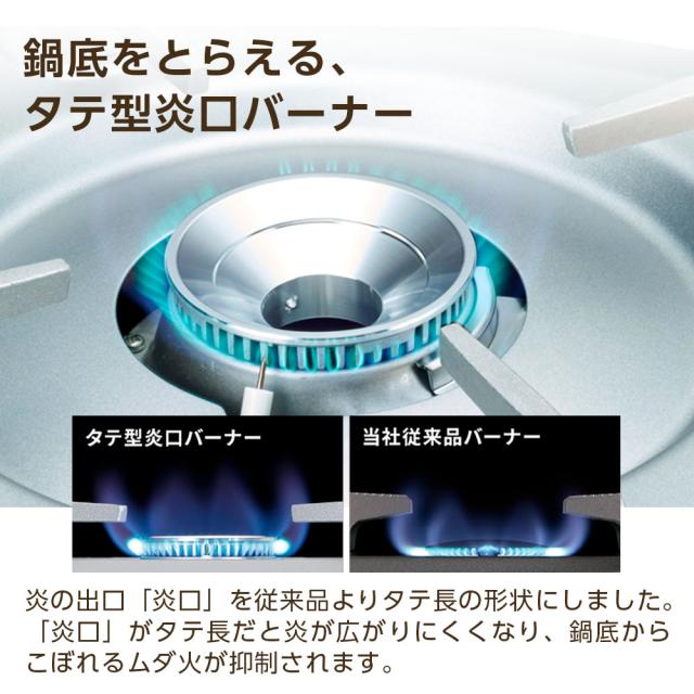 ムダ火を抑えるタテ型炎口バーナー炎の出口「炎口」がタテ長で炎が外に広がりにくく、鍋底からこぼれるムダ火を抑制。