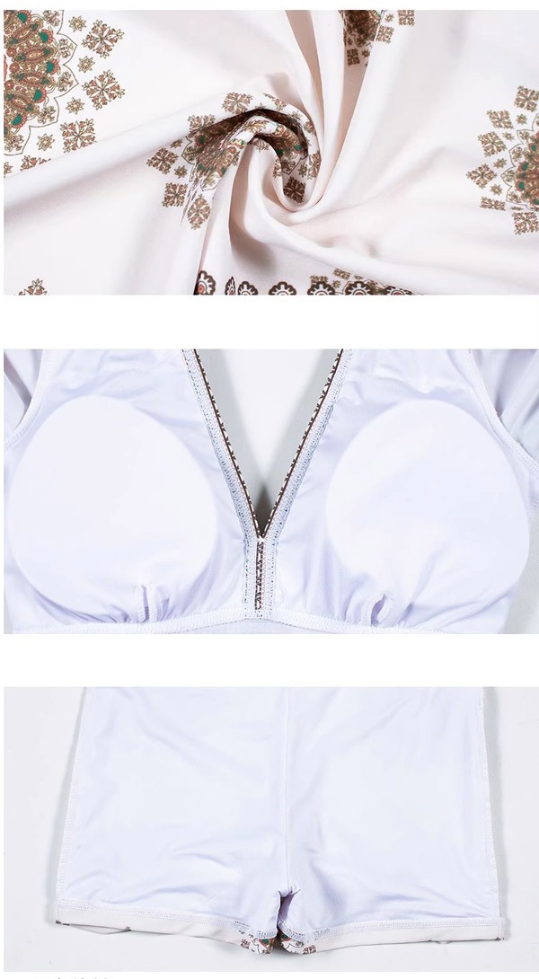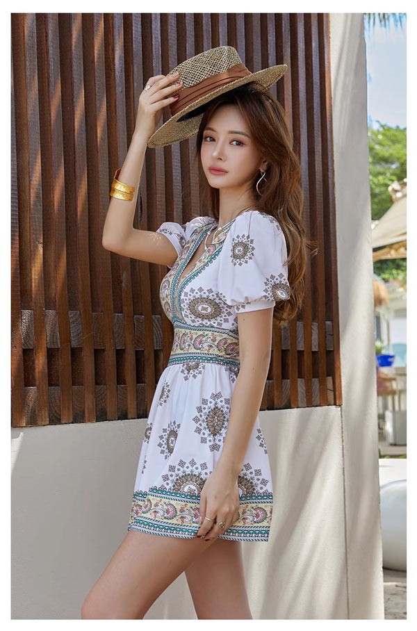 ワンピース水着 エスニック Vネック 服みたいな 水着 半袖 パッド付 レディース 着痩せ レトロ風 セクシー 写真映え 撮影用 海 夏 サマー プール リゾート かわいい 旅行 温泉 大人 女性用 母の日 大きいサイズ ホワイト マルチカラー M L XL 2XL