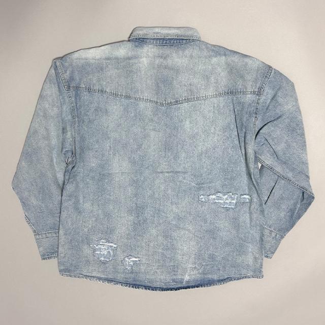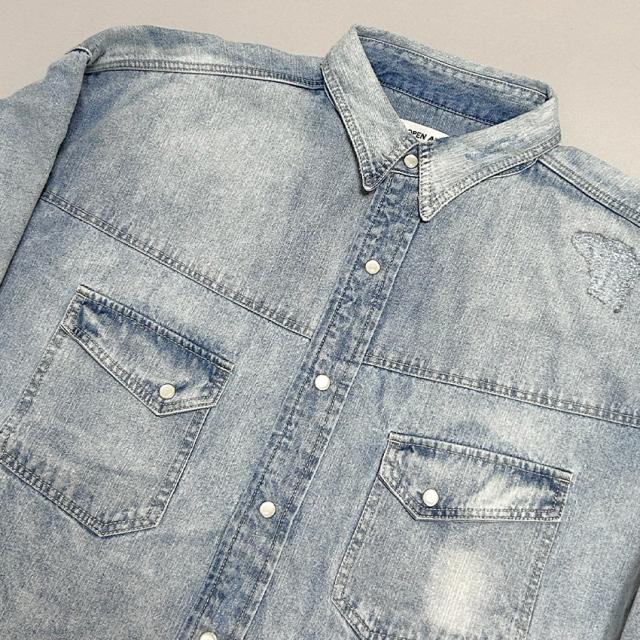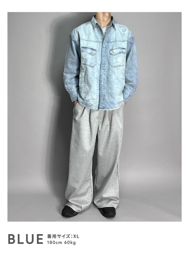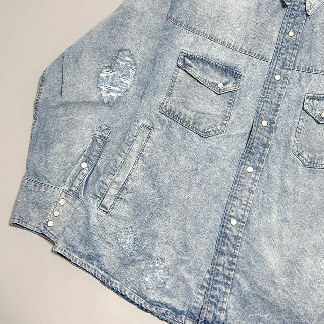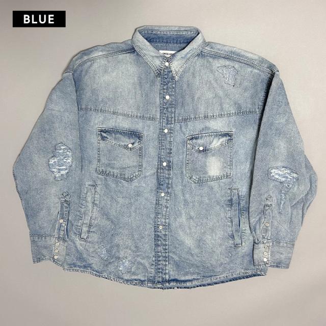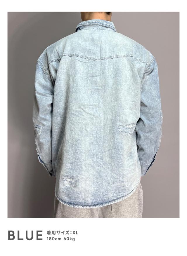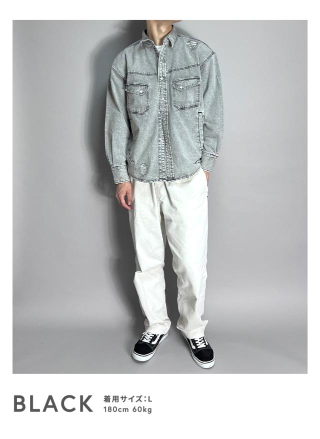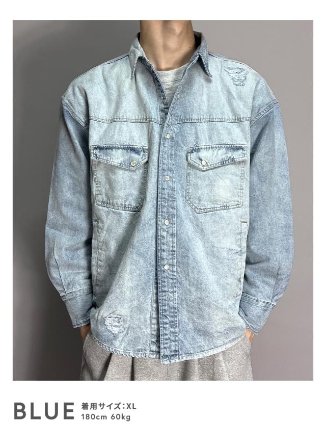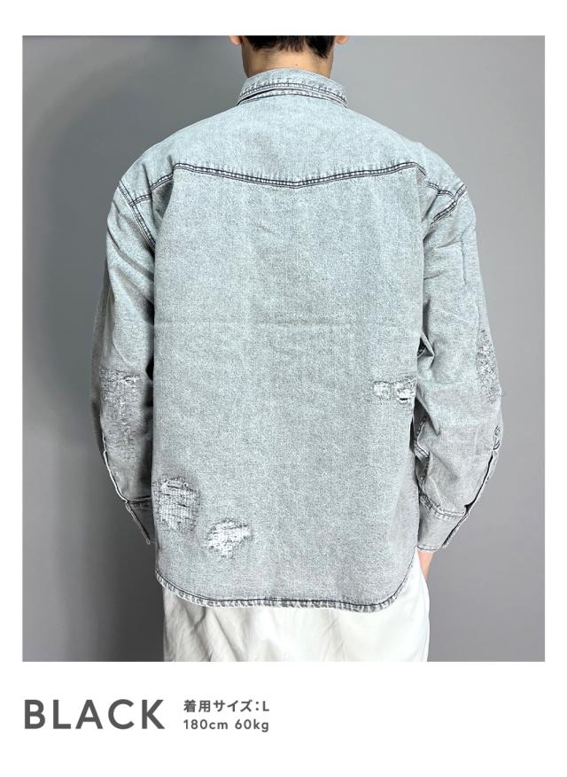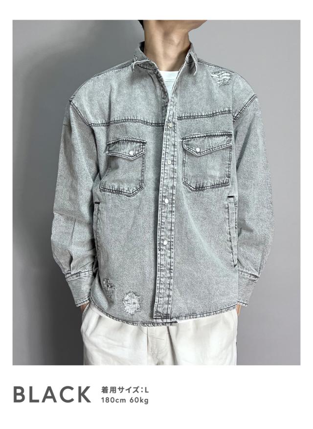 デニムシャツ メンズ 長袖 ヴィンテージ加工 ダメージ加工 アメカジ ブラック ブルー ブリーチ ゆったり 大きいサイズ 春 夏 秋 冬 30代 40代 50代 M L XL