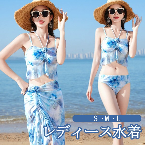 ビキニ水着 グラデーション 3点セット 上下セット パッド付 レディース 着痩せ 総柄 セクシー 写真映え 撮影用 海 夏 サマー プール リゾート かわいい 旅行 温泉 大人 女性用 母の日 大きいサイズ ブルー S M L