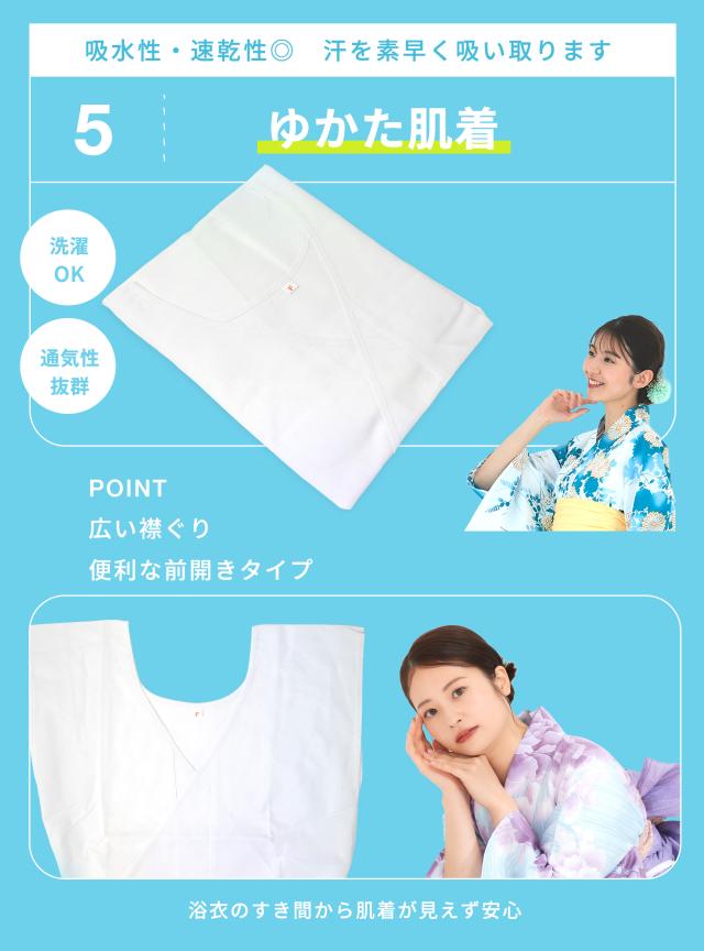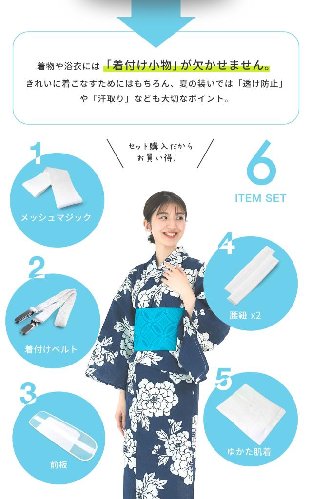 浴衣の着付けに必要な6点セットが含まれており、購入後すぐに使用できます。