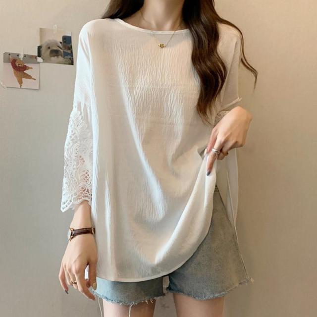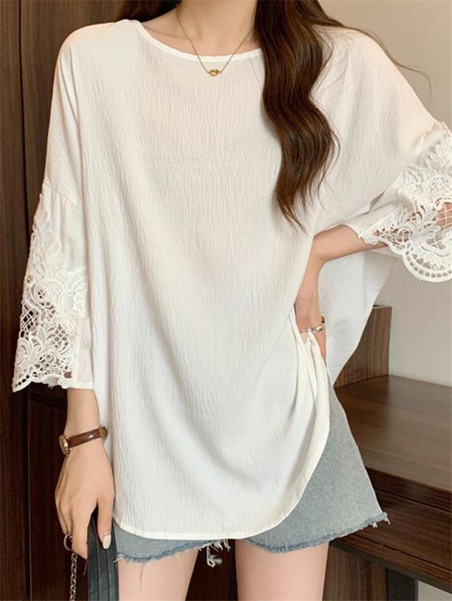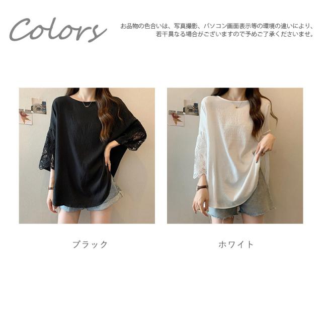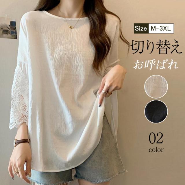 tシャツ レディース 夏 半袖 ドロップショルダー レース クルーネック ゆったり カットソー ブラウス トップス 大きいサイズ
