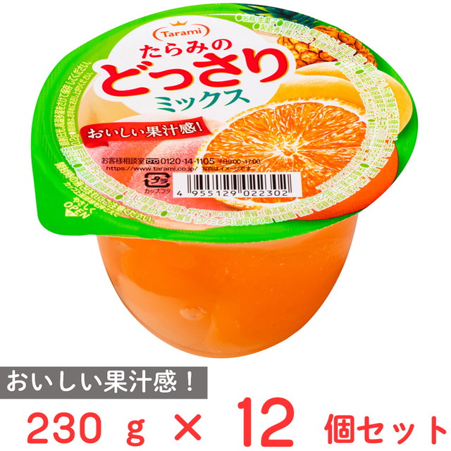 商品名 たらみ たらみのどっさり ミックス 230g×12個 容量 230g×12個 原材料名 果実(みかん(中国)、白桃、黄桃、パイン)、砂糖・果糖ぶどう糖液糖、ピーチ果汁、洋酒、寒天/ゲル化剤(増粘多糖類)、香料、酸味料、酸化防止剤(ビタミンC)、乳酸Ca アレルギー特定原材料 ー 賞味期限 商品の発送時点で、30日以上あるものをお届けいたします 保存方法 直射日光、高温多湿を避けて保存してください。