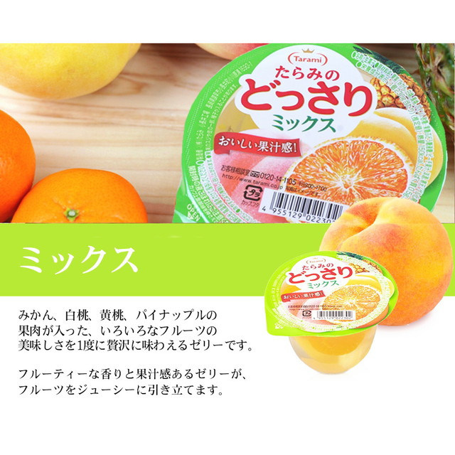 自然の恵み、フルーツそのままの美味しさたっぷり、ぷるんとみずみずしい、“たらみのどっさり”ゼリー【自然の恵みが、いつでもどこでも、たっぷり味わえるゼリー】たらみが厳選したフルーツの美味しさをそのまま、すっきりとした果汁感あるゼリーに閉じ込めました。【フルーティーな香りと果汁感】4種の果実(みかん、白桃、黄桃、パイン)が引き立つフルーティな美味しさ。【ぷるんとしながらもみずみずしい食感のゼリー】口当たりの良い、ぷるんとしたみずみずしいゼリーがみかん、白桃、黄桃、パイン果肉をジューシーに引き立てます。