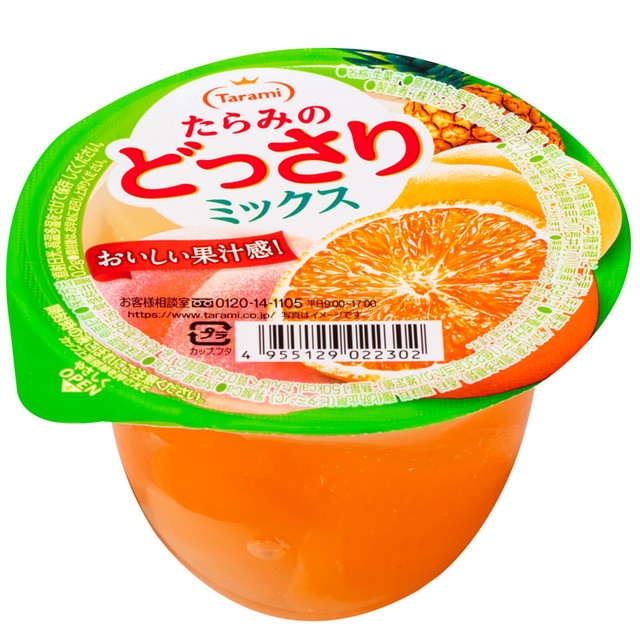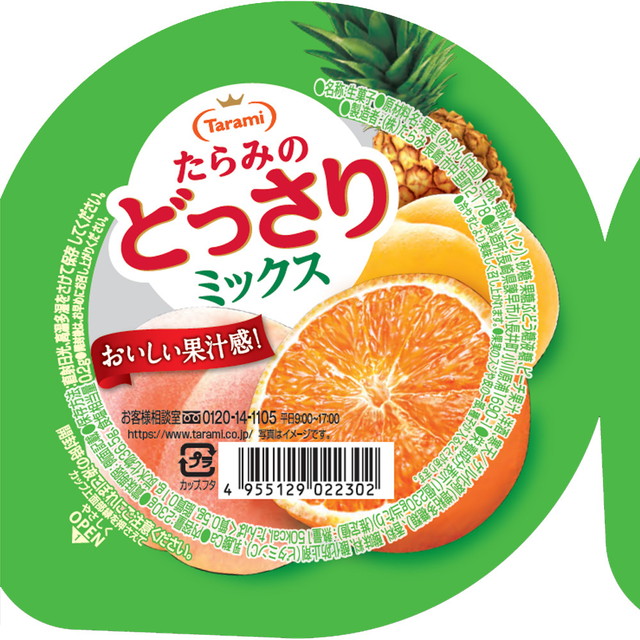 自然の恵み、フルーツそのままの美味しさたっぷり、ぷるんとみずみずしい、“たらみのどっさり”ゼリー【自然の恵みが、いつでもどこでも、たっぷり味わえるゼリー】たらみが厳選したフルーツの美味しさをそのまま、すっきりとした果汁感あるゼリーに閉じ込めました。【フルーティーな香りと果汁感】4種の果実(みかん、白桃、黄桃、パイン)が引き立つフルーティな美味しさ。【ぷるんとしながらもみずみずしい食感のゼリー】口当たりの良い、ぷるんとしたみずみずしいゼリーがみかん、白桃、黄桃、パイン果肉をジューシーに引き立てます。