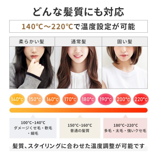 片手で温度調整140°C~220°Cの温度設定が可能です。素早く設定温度が上がり忙しい朝に役立ちます。ダイヤル式温度設定なので、どなたでも簡単に使用できます。