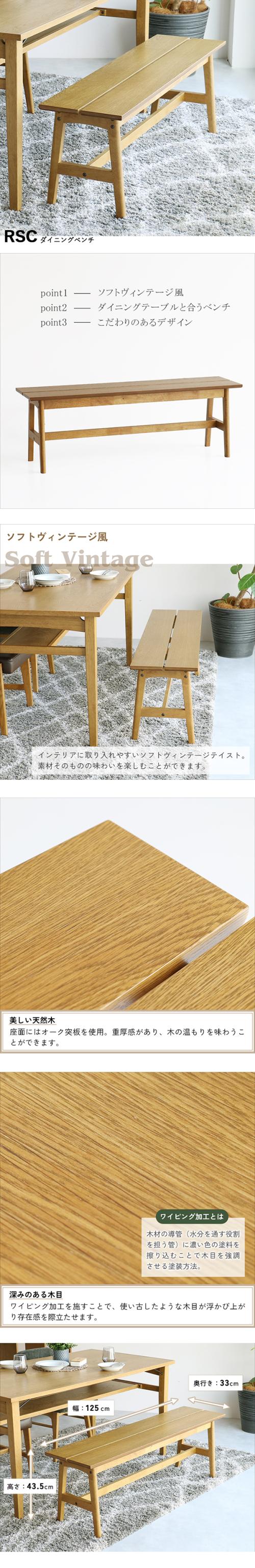 RSC ダイニングベンチ 【1脚単品】 カラー| ナチュラル色(オーク) サイズ| 横幅125 奥行33 高さ74cm座面高さ43.5cm 主素材| ラバーウッド材 天然木 無垢 北欧スタイル シンプル木製ベンチ