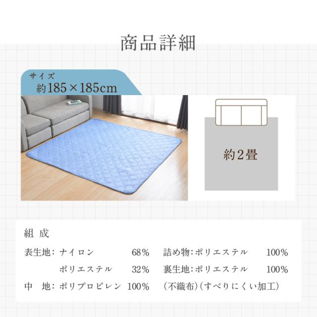 size: 約185×185cm[2畳相当] 素材: 表生地:ナイロン 68% ポリエステル 32% 中 地:ポリプロピレン 100% 詰め物:ポリエステル 100% 裏生地:ポリエステル 100% (不織布)(すべりにくい加工) ※サイズは全て外寸になります。 ※製品の仕様変更などに伴い、急遽、生産国などが変わる場合がございます。 予めご了承下さい。 【機能】 ・洗濯機で洗えます ・裏面に滑り止め加工付き 【生産国】中国 ※不明な点がございましたら、お気軽にお問い合わせ下さい。 |