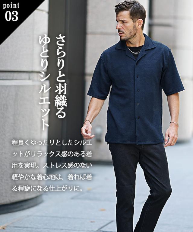 軽やかな艶魅せ夏スタイル『ジャガード開襟半袖シャツ』【ジャガード開襟半袖シャツ】■Design/デザイン軽快に着こなすオトナの半袖オープンカラーシャツ。透け感のある薄手な素材感で仕上げることで汗ばむ季節も軽快な穿き心地を実現。程よいリラックスシルエットで窮屈さを感じさせない佇まいに。ジャガード織りで生地全体に柄をデザインしさりげなく存在感を発揮するのもポイント。どこかリゾートな雰囲気を纏いながら艶やかな品格も兼ね備えた一着。■Material/素材感ポリエステルを使用した、程よくしっとりとした生地感が特徴。薄手の素材感であるだけでなく、伸縮素材を採用することで、ストレスフリーな着心地を楽しめる。